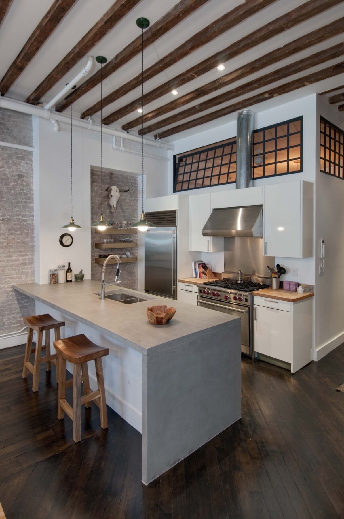 This industrial kitchen makes use of the end wall with a set of narrow shelves.