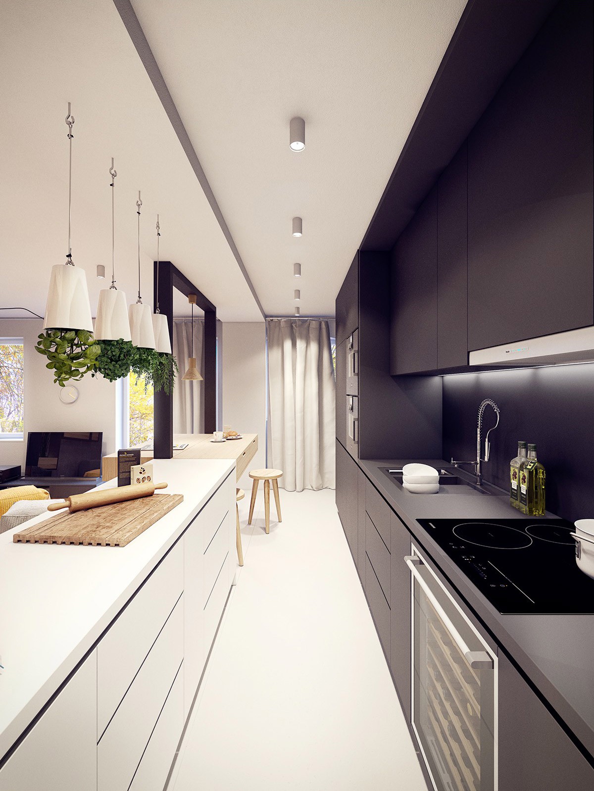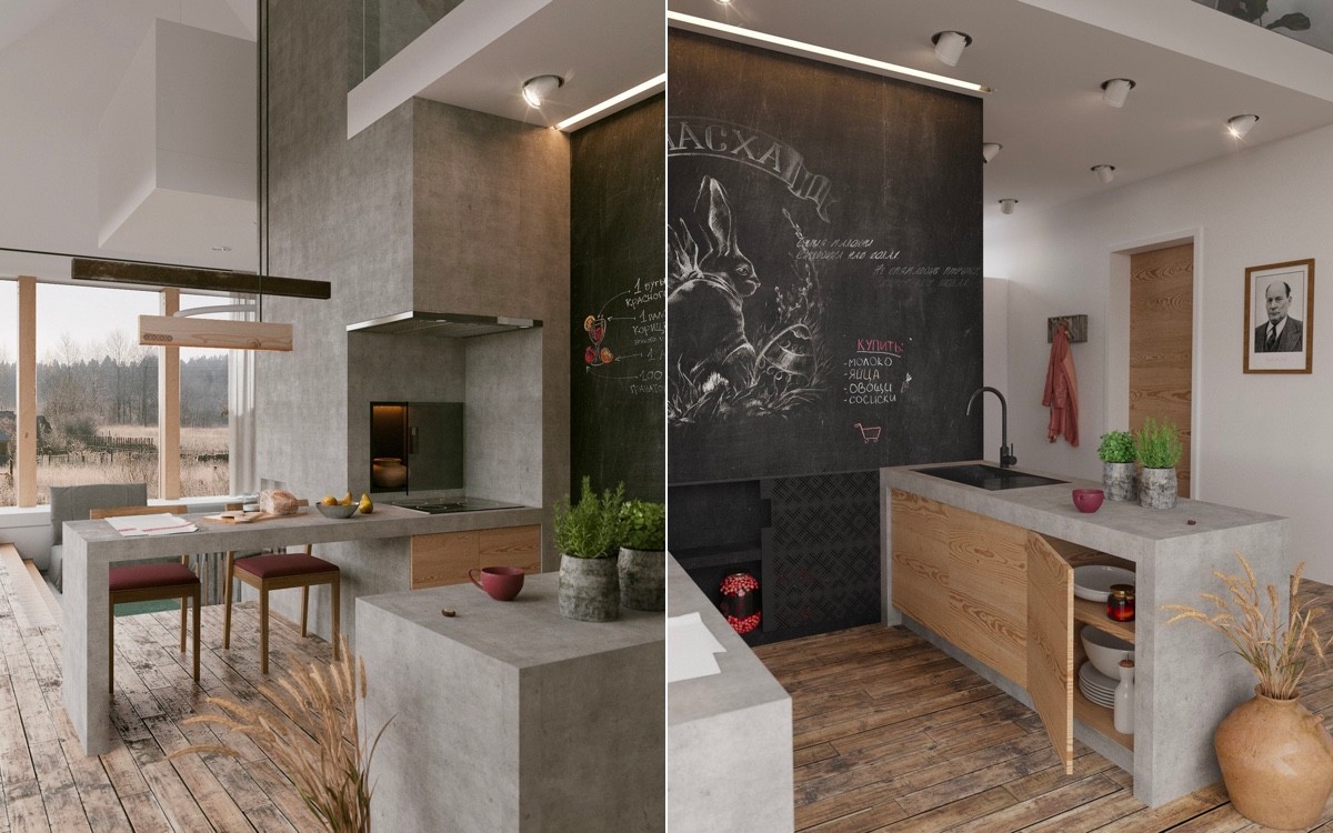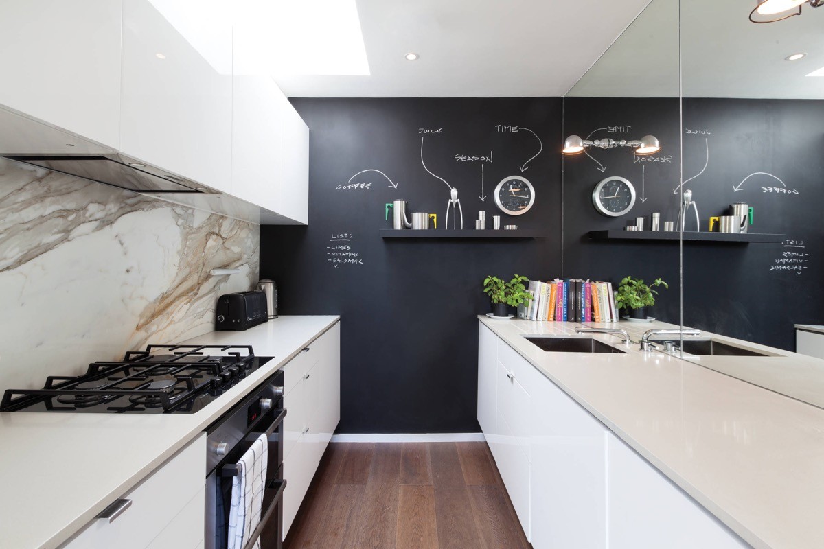 A chalkboard makes a cool and useful feature wall at the end of a kitchen galley space.