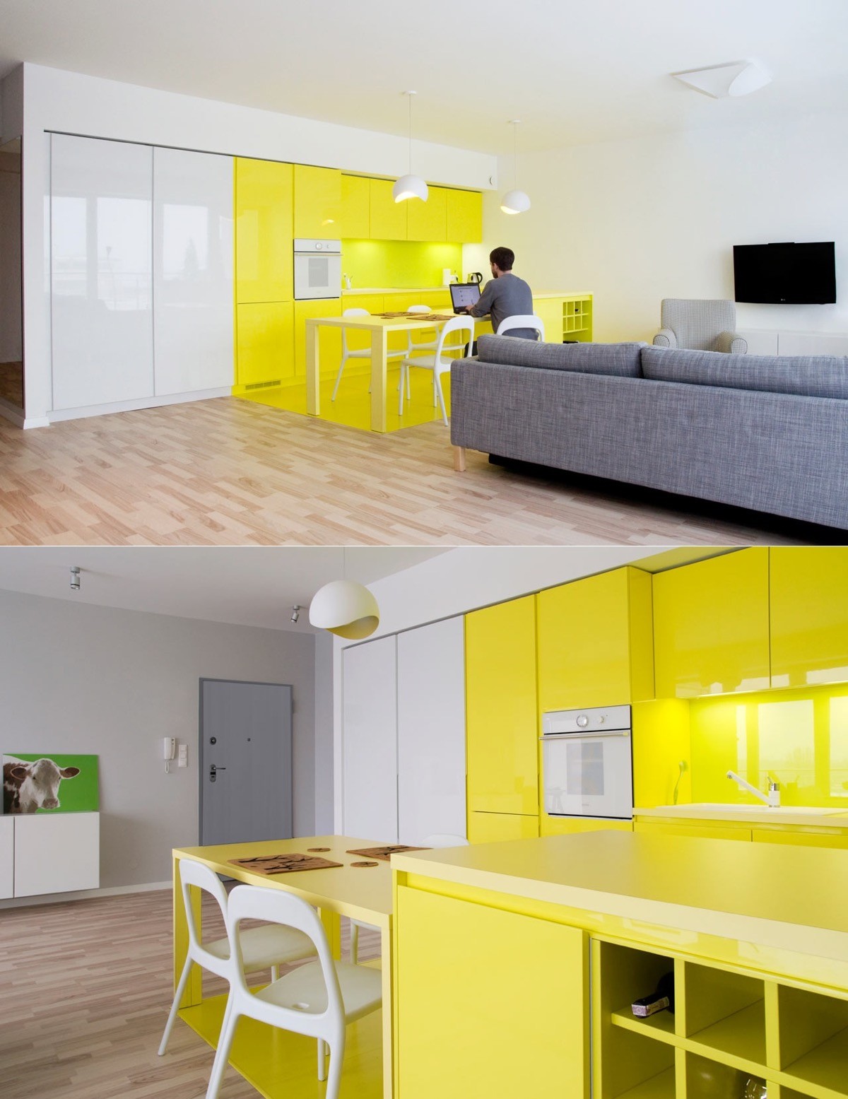 Break up a long run of units using colour sections, like this yellow and white minimalist kitchen.