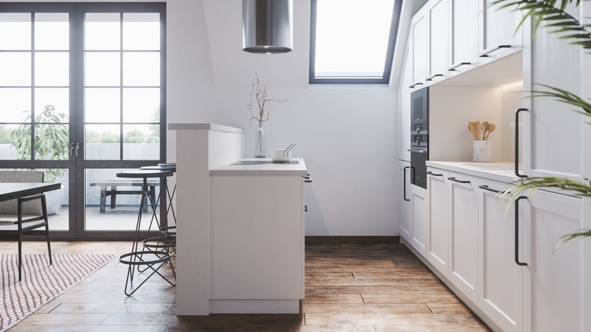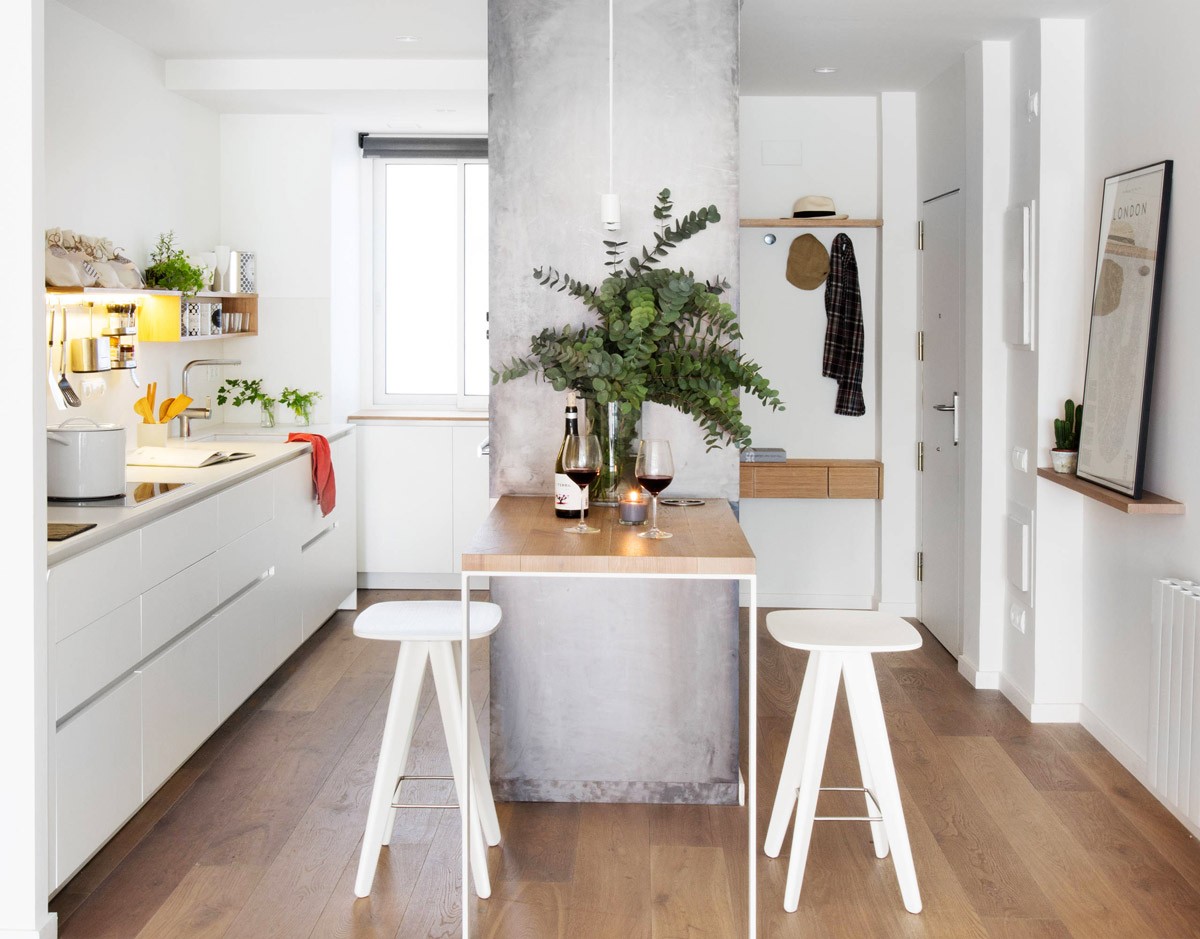 Introduce a wooden section to warm a white kitchen.