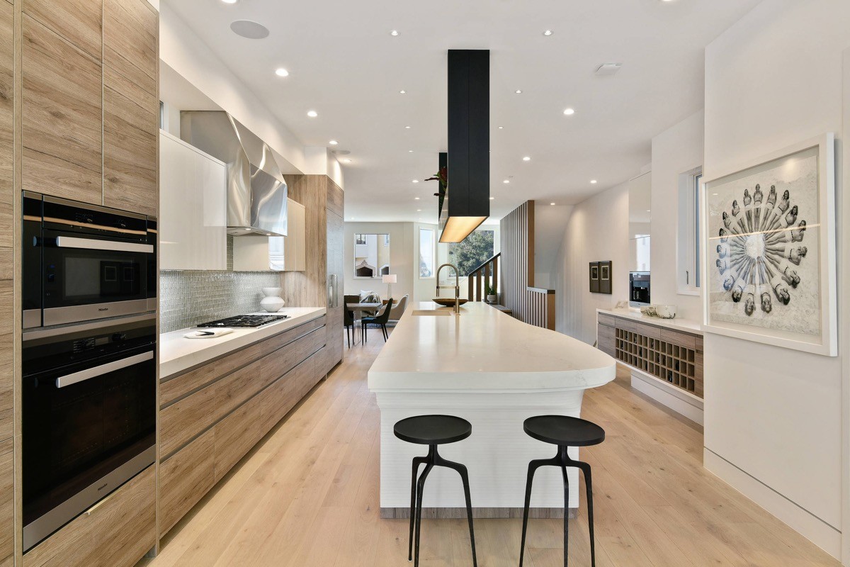 Install a lighting soffit rather than low hung pendant lighting for a no-fuss sleek modern kitchen.