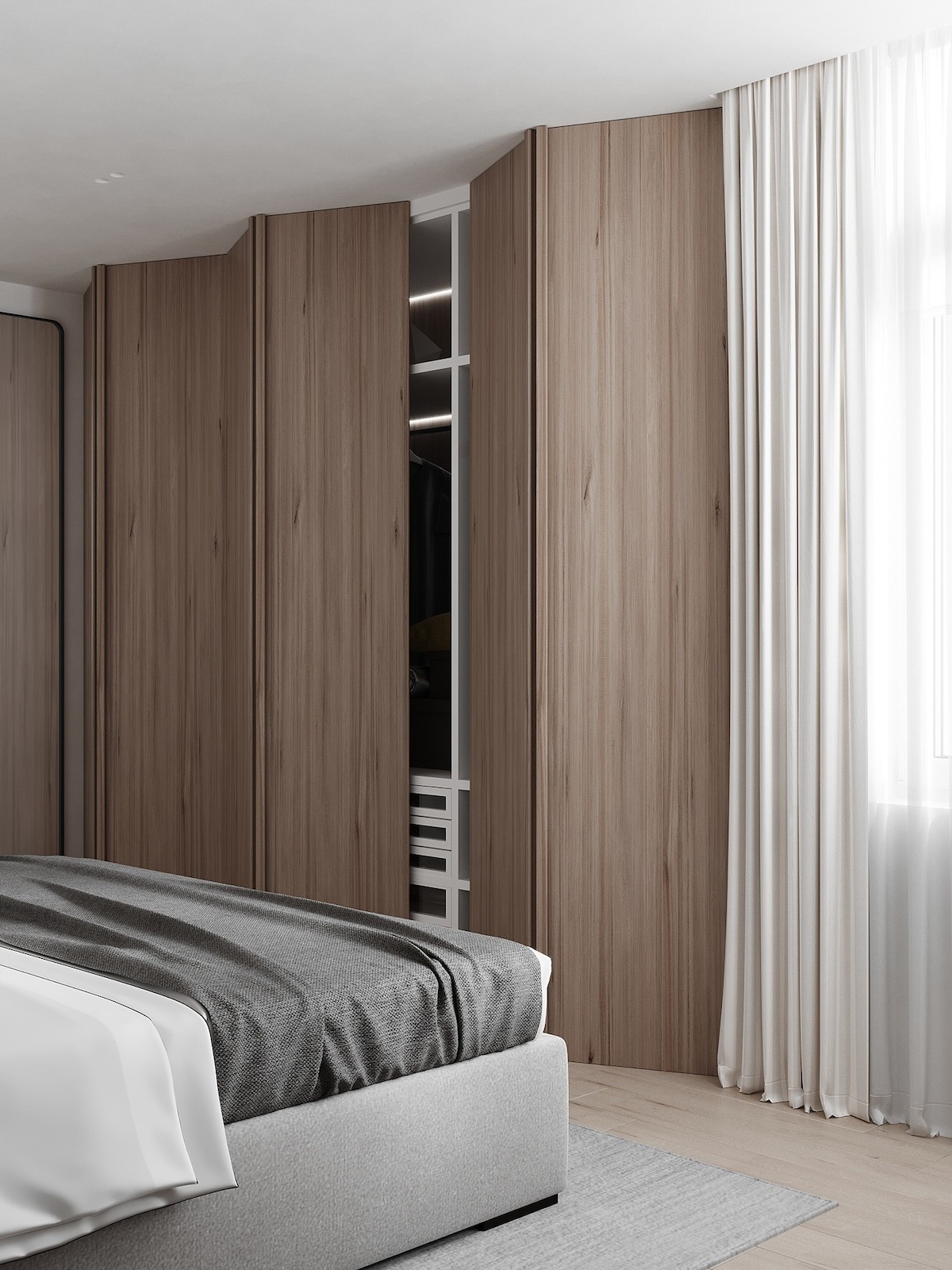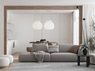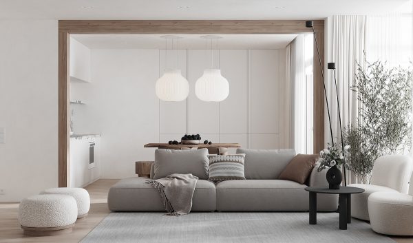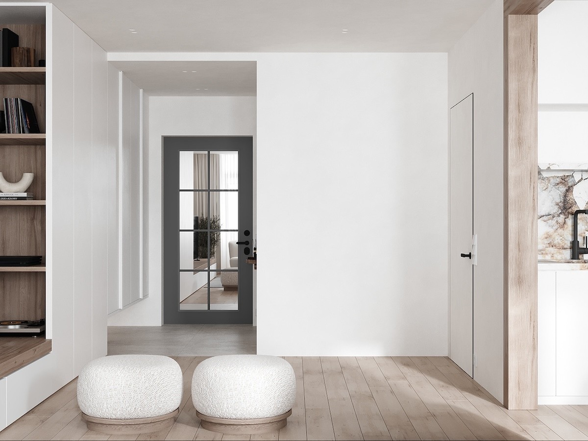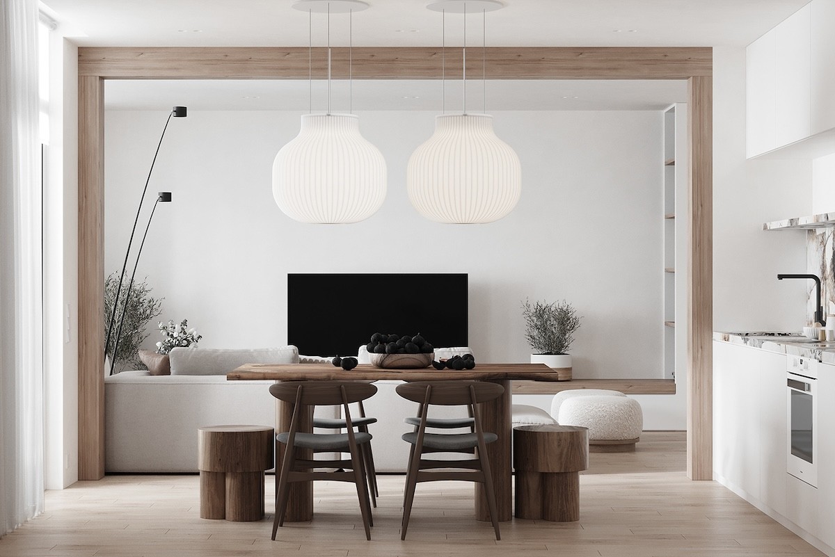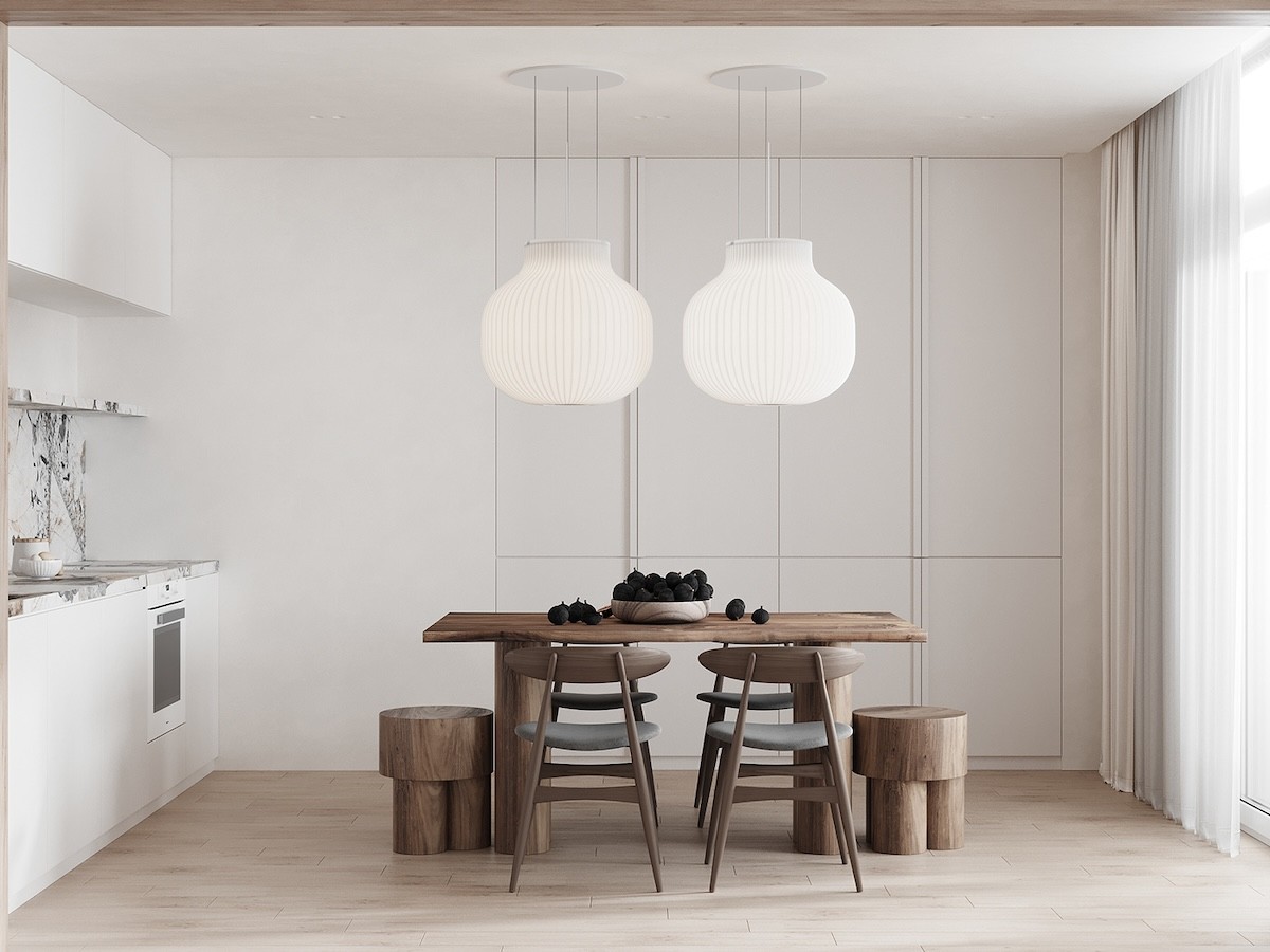 Created by Tomkin Design and visualized by Nastia Perchyk, this modern home interior is a soothing medley of gray, white, and wood accents. The earthy, wood-furnished dining room gives the fresh modern apartment a warm bohemian heart, which branches into other aspects of the home. Deep wooden door reveals and chunky timber surfaces counteract cool white backdrops. Oversized pendant lights make unexpected, attention-grabbing focal points. Bespoke built-in furniture designs give the apartment a clean aesthetic, as well as an abundance of storage and home organization opportunities. The bedroom is a minimalist setting with cozy undertones, while the compact bathroom offers inspiration for endowing small spaces with style.