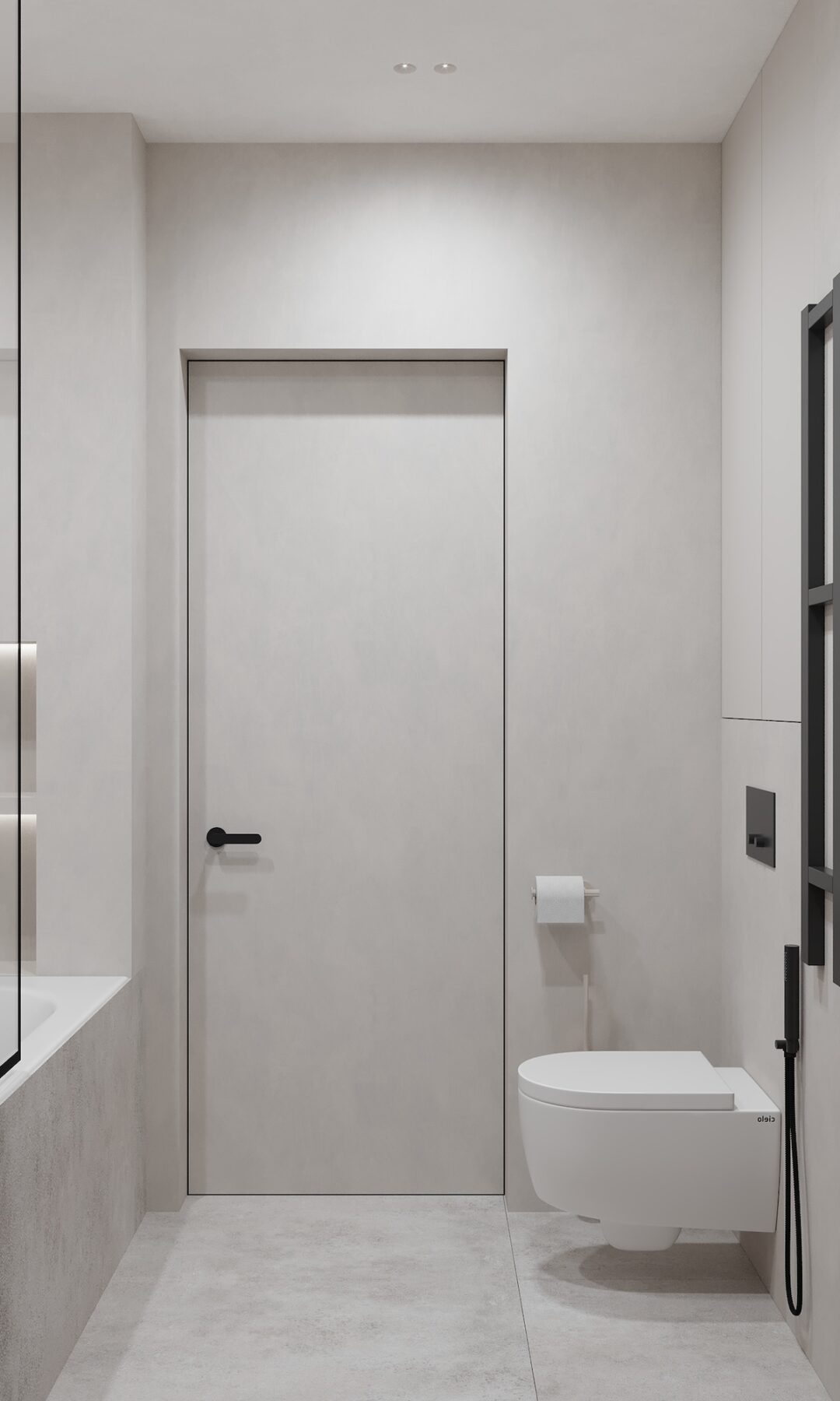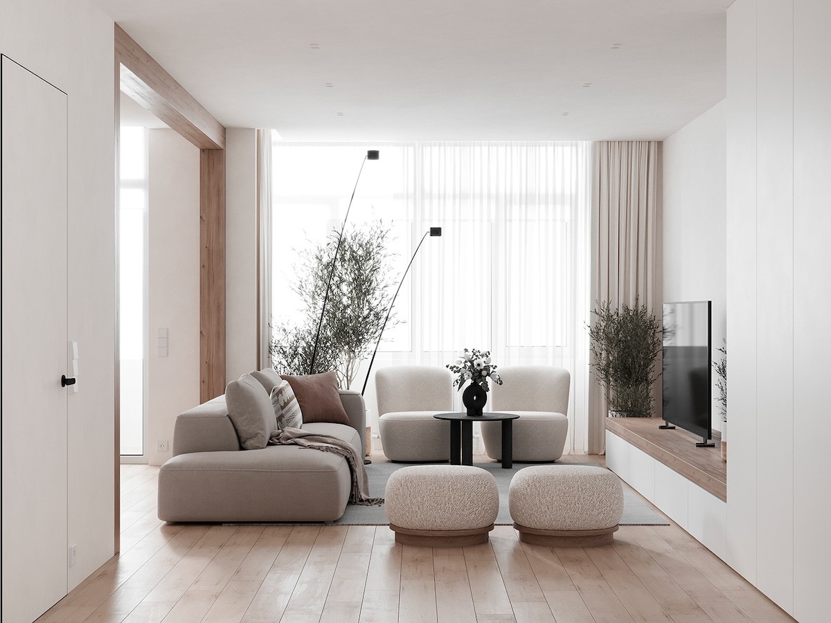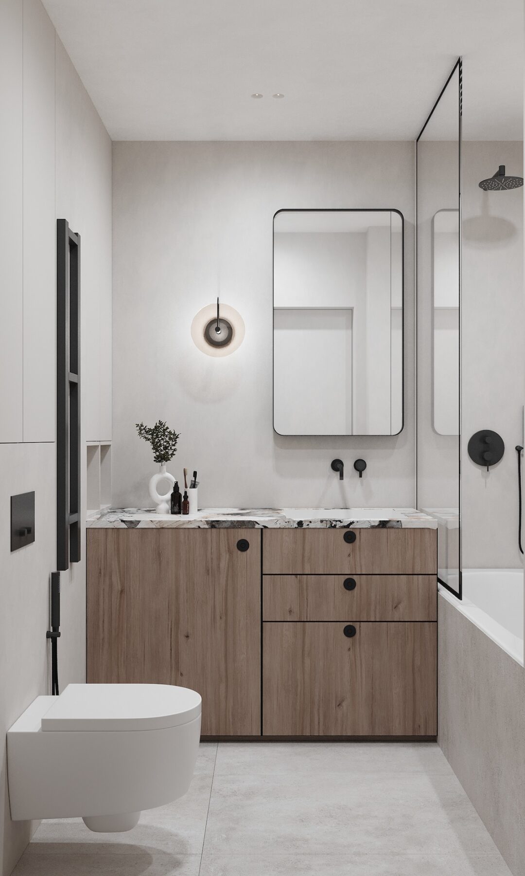 Created by Tomkin Design and visualized by Nastia Perchyk, this modern home interior is a soothing medley of gray, white, and wood accents. The earthy, wood-furnished dining room gives the fresh modern apartment a warm bohemian heart, which branches into other aspects of the home. Deep wooden door reveals and chunky timber surfaces counteract cool white backdrops. Oversized pendant lights make unexpected, attention-grabbing focal points. Bespoke built-in furniture designs give the apartment a clean aesthetic, as well as an abundance of storage and home organization opportunities. The bedroom is a minimalist setting with cozy undertones, while the compact bathroom offers inspiration for endowing small spaces with style.