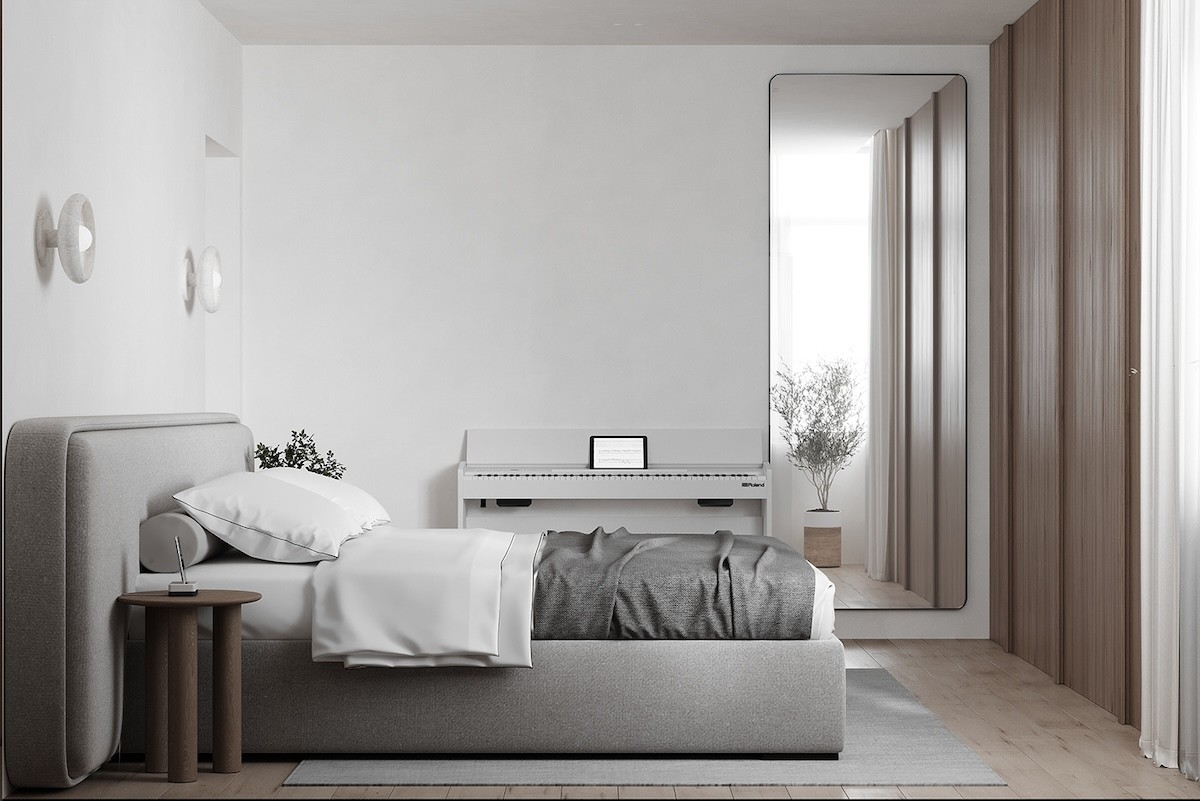 A full-length wall mirror is mounted near a run of made-to-measure wooden wardrobes to fashion a well-equipped dressing area. A white digital piano allows the homeowner to practice music in the privacy of their bedroom while taking little space and being quiet with headphone use.