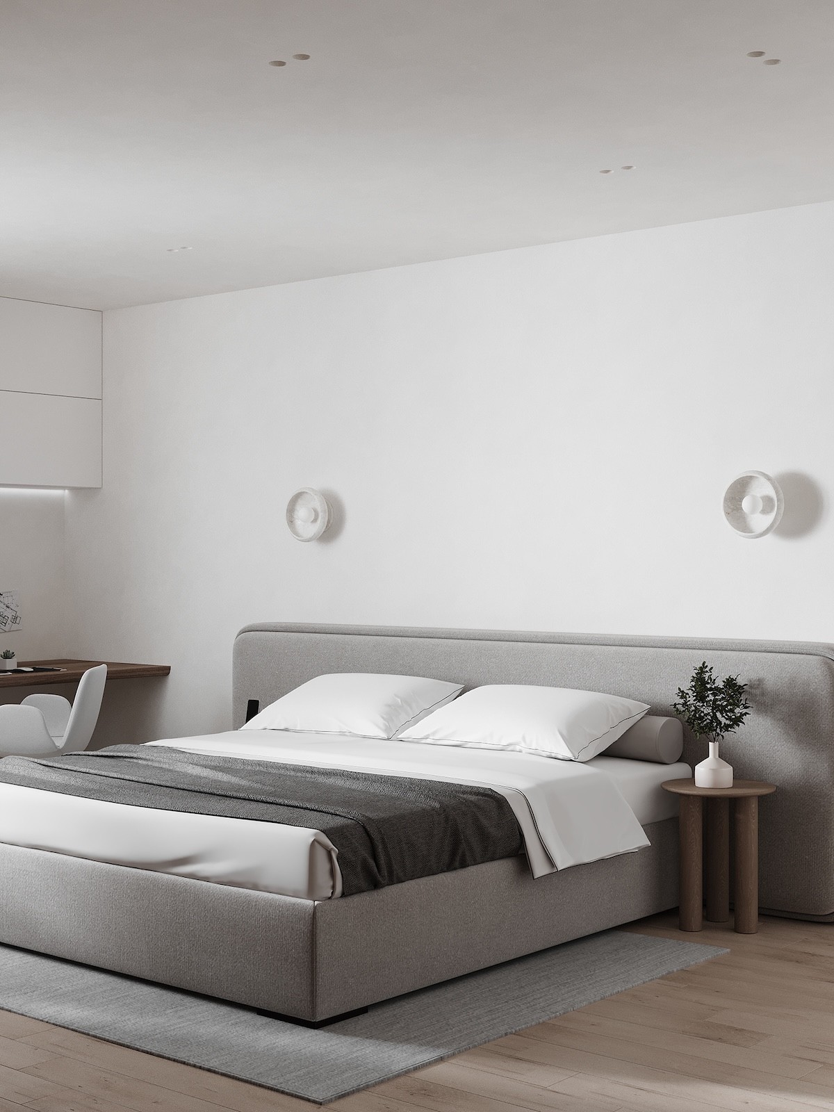 In the master bedroom, an upholstered gray bed is set upon a plain gray rug to create a soft, textural core in the space. Crisp white bed clothes are contrasted by a dark gray bed runner. Wooden side tables add natural warmth to the ensemble, while a decorative vase fetches a fresh sprig of greenery. Modern wall sconces provide reading light over the bed.