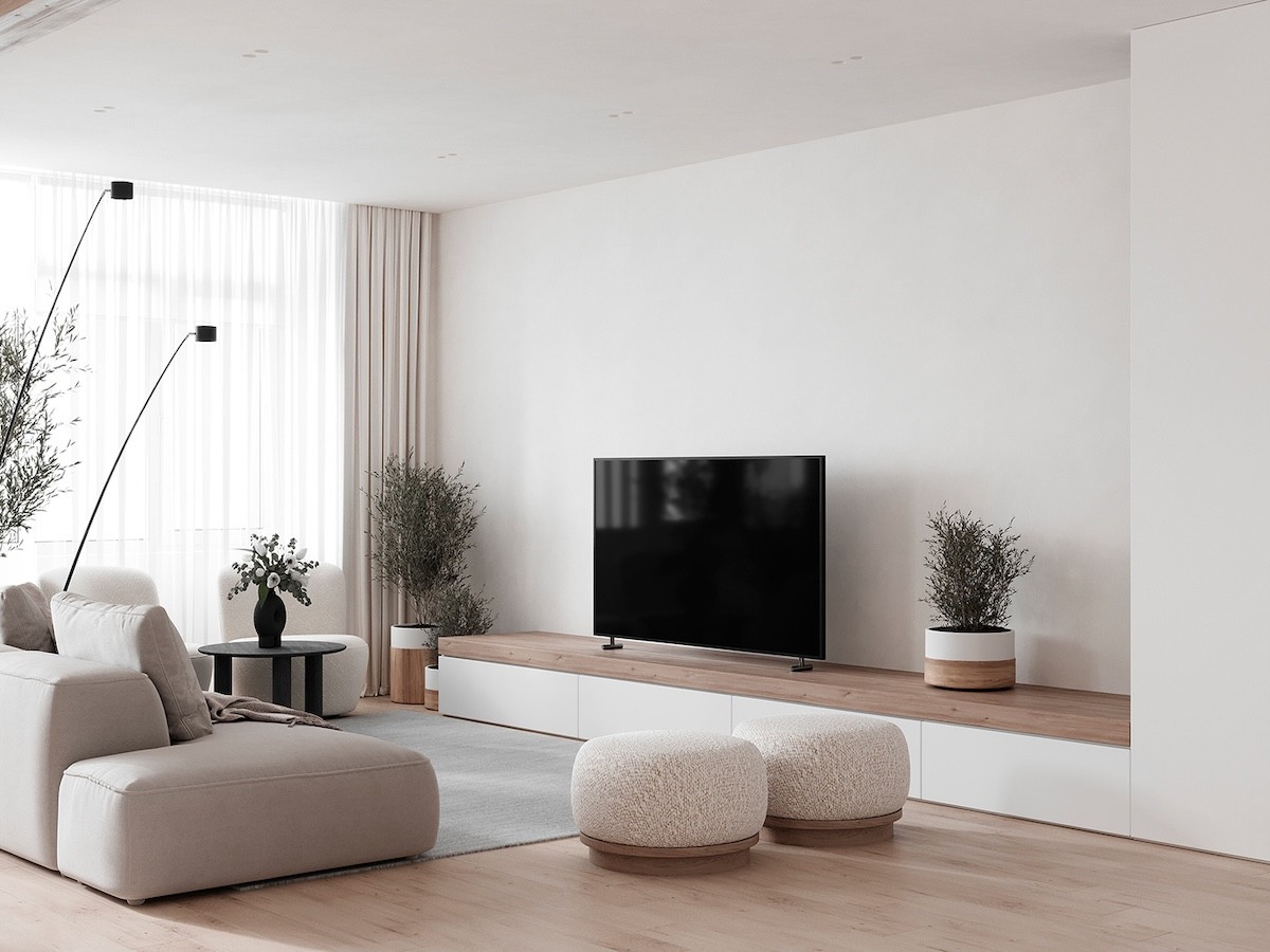 The TV stands on a bespoke media console unit that spans almost the full width of the room. A series of drawers provide ample storage for movies, remote controls, and games controllers. A chunky wooden top crowns the simple white drawer unit, giving it a bold natural twist. Indoor plants build upon the modern boho vibe.