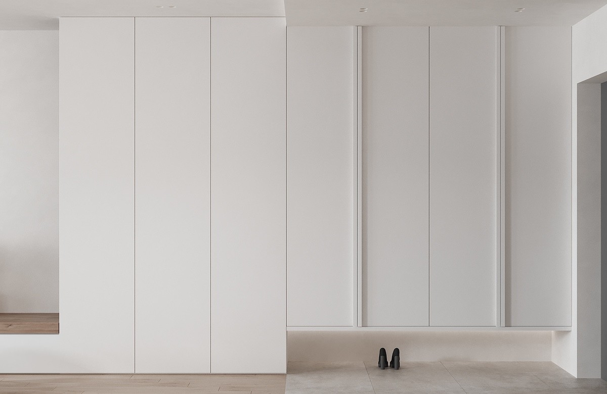 A concealed LED strip glows at the back of the shoe storage niche to aid the homeowner and their guests in finding their footwear.