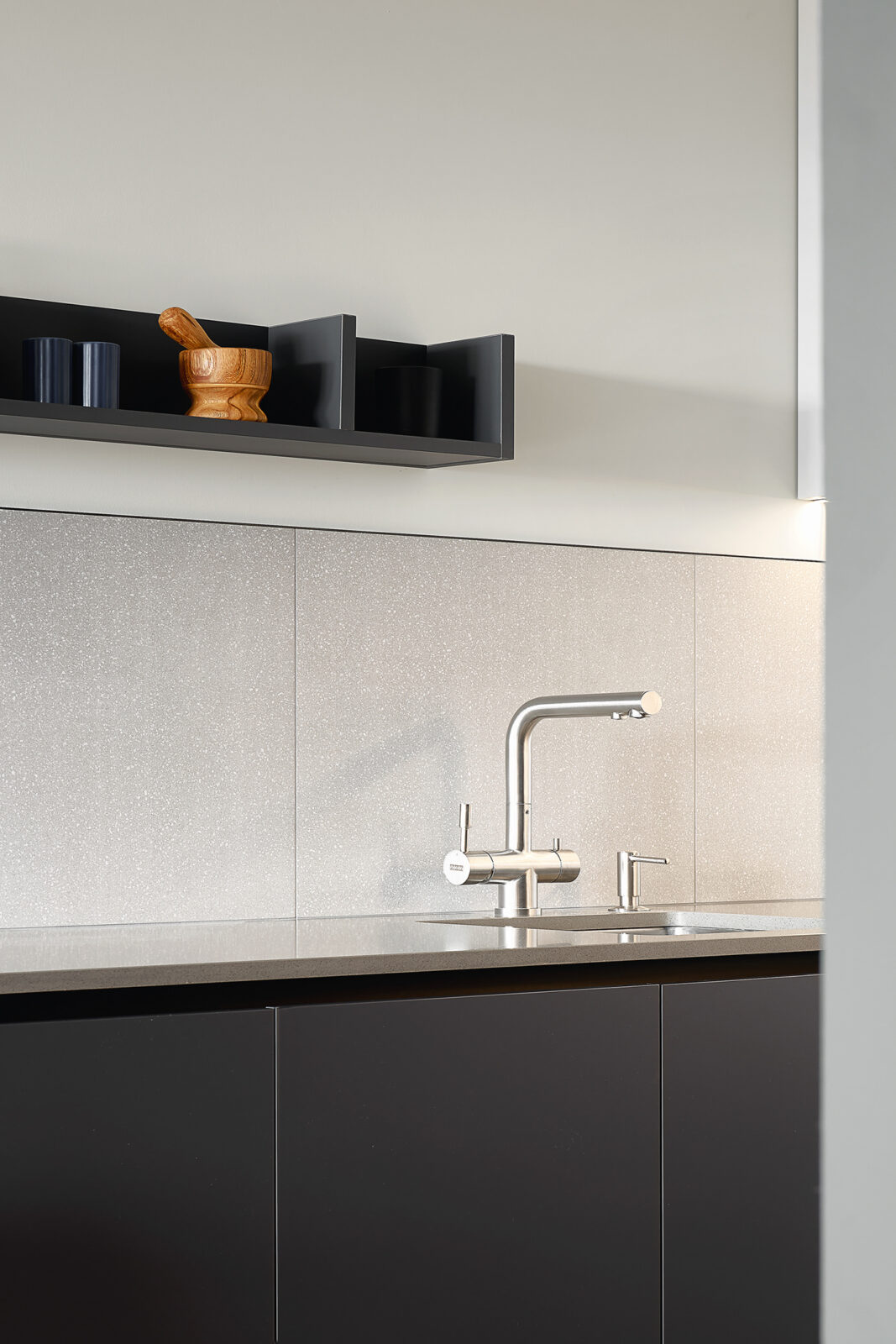 The countertops and sink faucet are kept minimal so the speckled backsplash can stand out. A slim black shelf sits above it, holding just a few glasses and warm wood accents.
