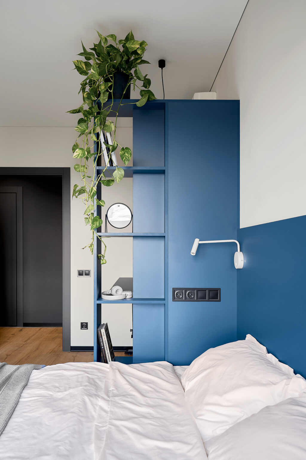 Calmness takes over when you step into the bedroom of the Modern Grid Apartment. Blue is on the lead here, wrapping the headboard wall and the shelving divider in a rich, modern tone. Furniture is kept low to create a relaxed, easy feel.