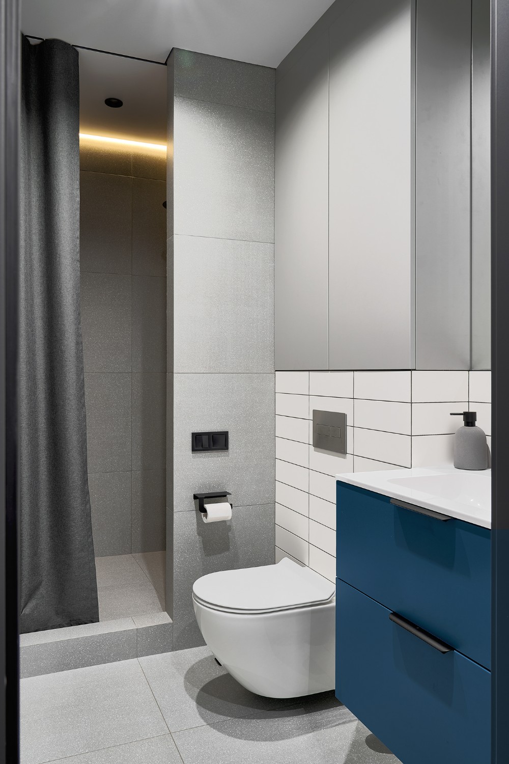 Things are looking crisp & modern in the bathroom. Light grey tiles prevent the interior from feeling too boxed-in, while the blue vanity ties back to the palette used throughout the apartment. White subway tiles break up the grey and make the sink area feel brighter.