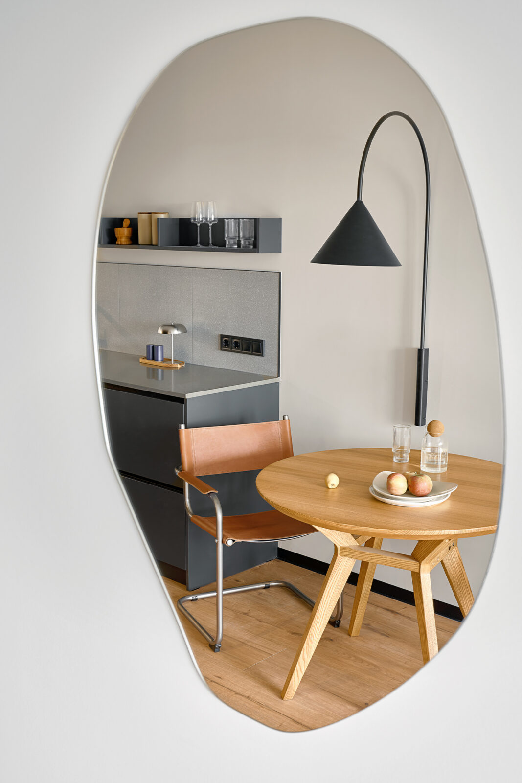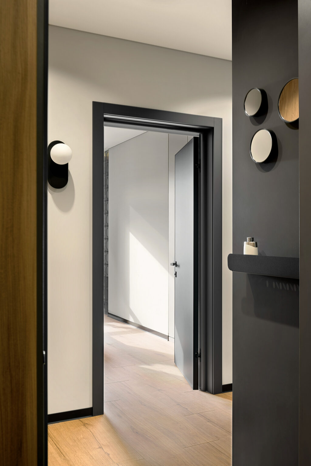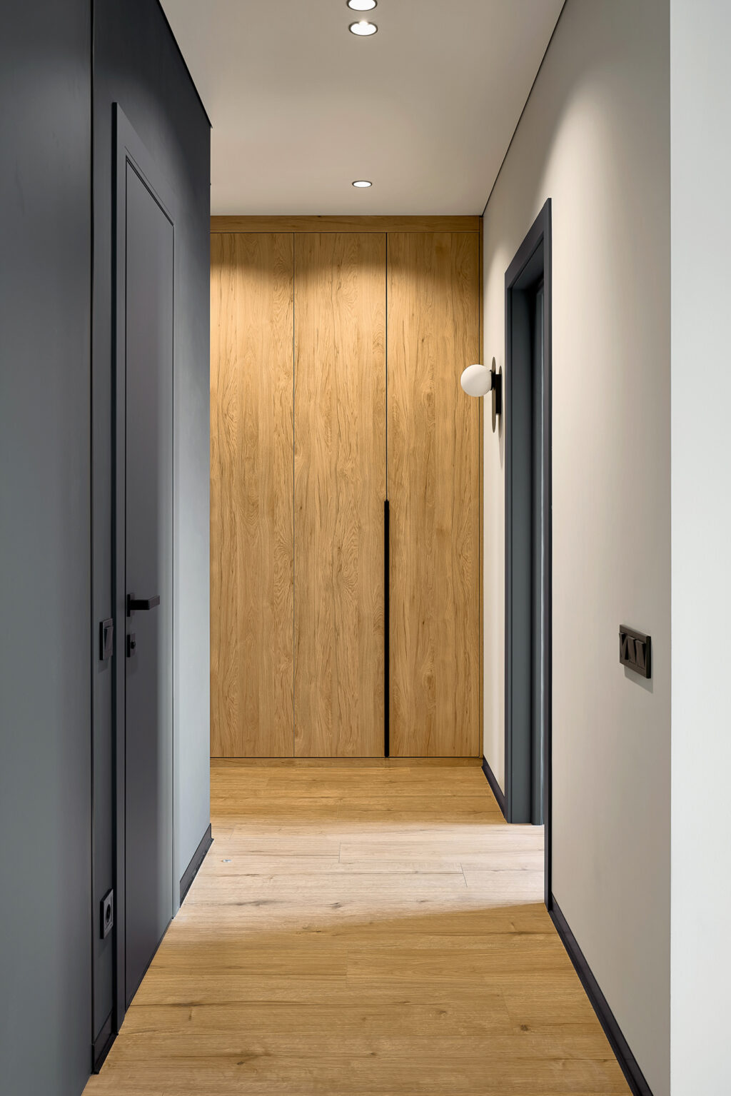 The hallway sets the tone for the apartment, where black-framed doorways create clean graphic lines. Warm wood wardrobes stretch across one wall, giving you plenty of hidden storage; their tall black handles echo the apartment’s modern grid theme.