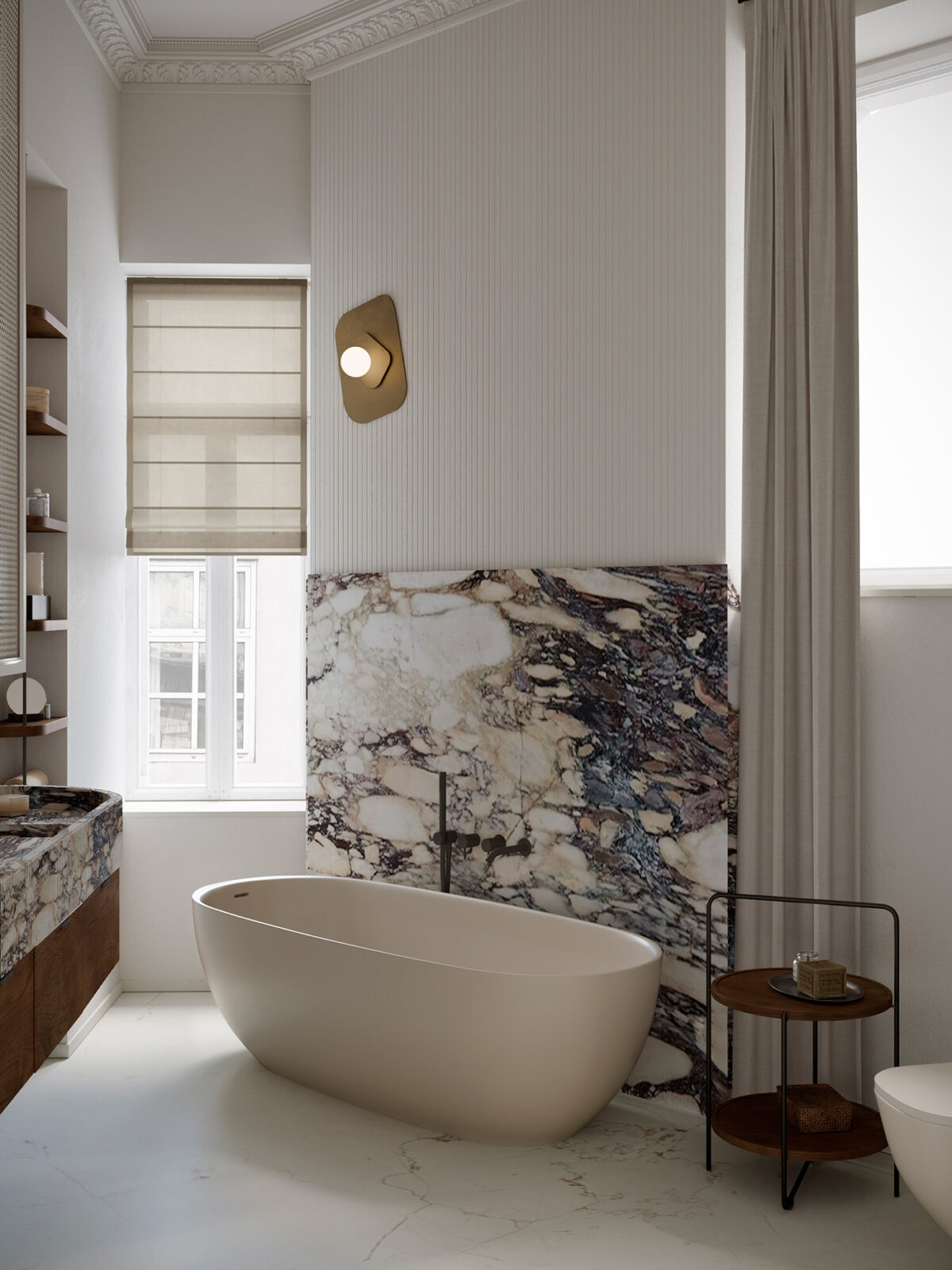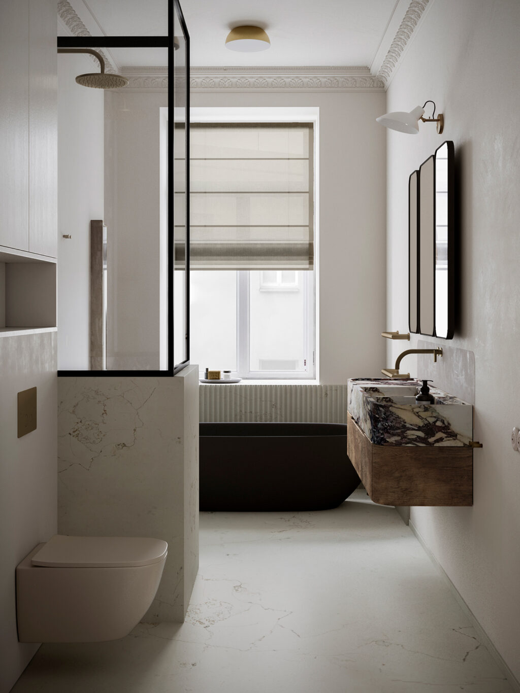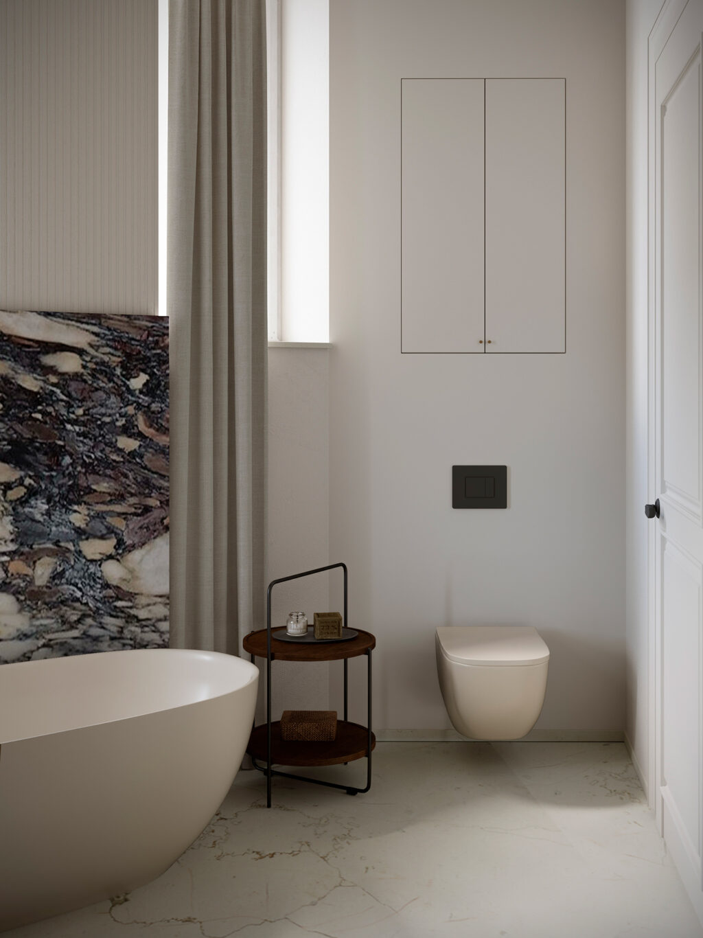 The second bathroom feels just as calm. A freestanding tub becomes the focal point, set against expressive marble, a key design element of the Modern Marble Apartment.