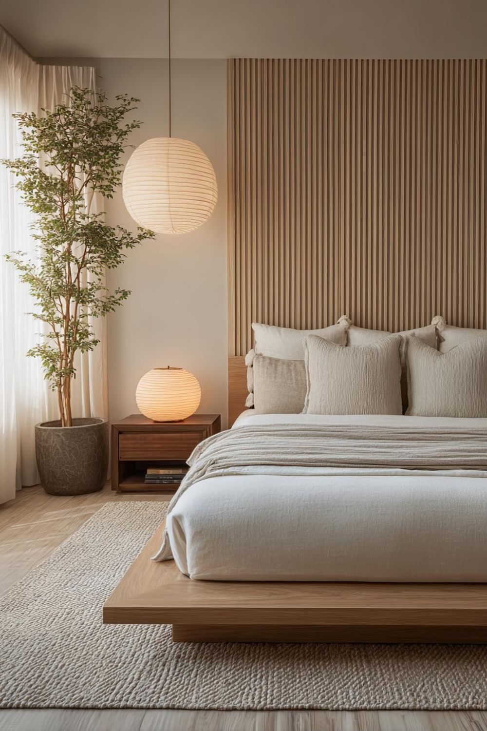 Natural materials are the backbone of a Japandi bedroom because they create a calm, grounded atmosphere that supports rest. Wood, linen, cotton, wool, clay, and stone introduce warmth and tactility without visual clutter. These materials age beautifully and feel honest, which aligns with both Japanese and Scandinavian design philosophies. In a bedroom, natural materials help soften acoustics, regulate temperature, and make the space feel more breathable. Whether it’s a wooden bed frame, linen bedding, or a wool rug underfoot, these elements work quietly together to create a sleep environment that feels balanced, timeless, and deeply restorative.