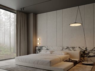 Marble always gives any room a glow-up. Take this mesmerizing black-veined white marble headboard slab for instance; its understated presence creates undeniable opulence. In this luxury bedroom concept, the smooth, cool marble headboard is warmly contrasted by a textile focal wall. Pull vertical layering together with a tall floor reading lamp beside the bed that will draw the eye from top to bottom.