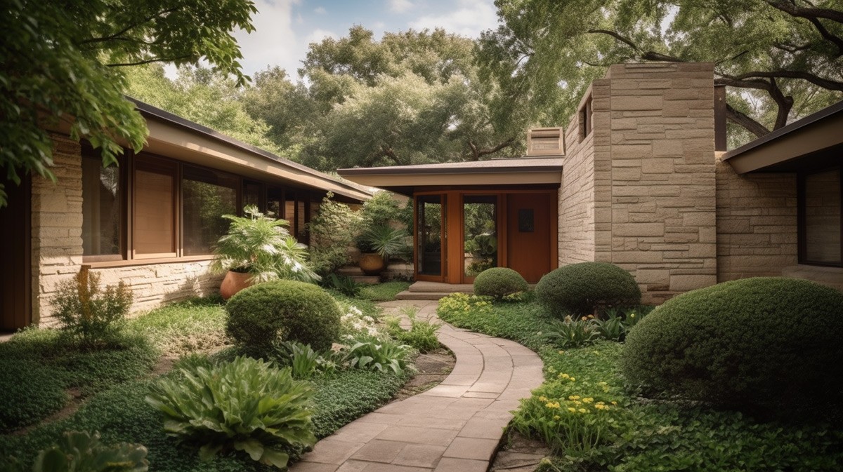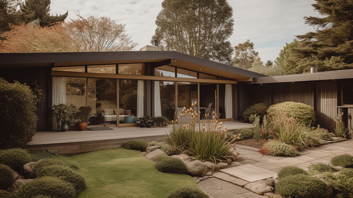 The roofline of this stylish mid-century modern home gracefully extends into a pergola, adding a touch of elegance to the manicured garden.