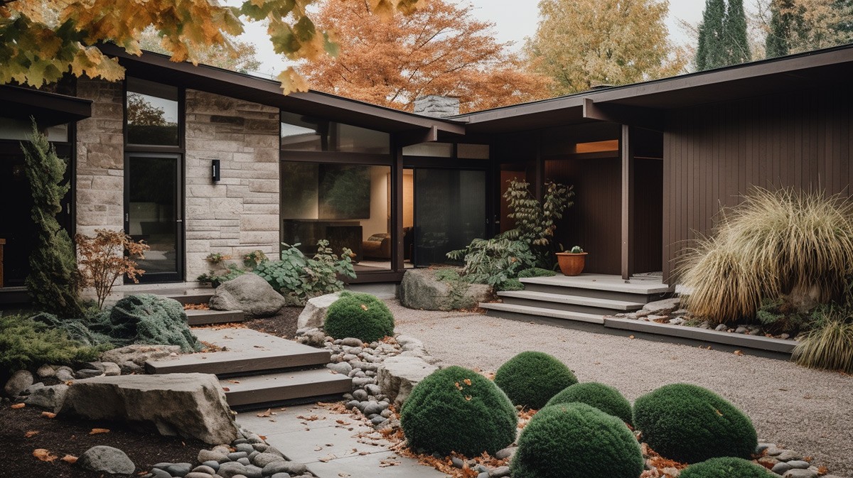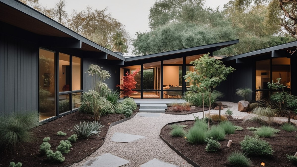 A meandering pathway joins the sharp, black volumes of this single-level mid-century modern AI visualization. Love black houses like these? If you enjoy dark facades like these, don't forget to check out our post on black houses for more.