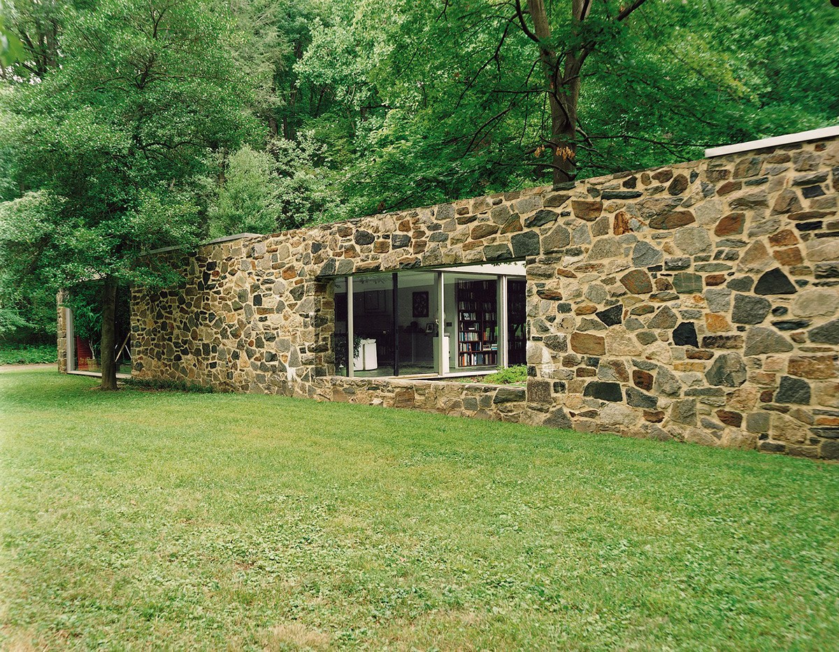The Hooper House II in Baltimore County, Maryland, was completed in 1959. A central courtyard divides the binuclear house into separate areas of function. Thick stone walls feature a large rectangular opening, which cuts out a striking view of Lake Roland through the property.