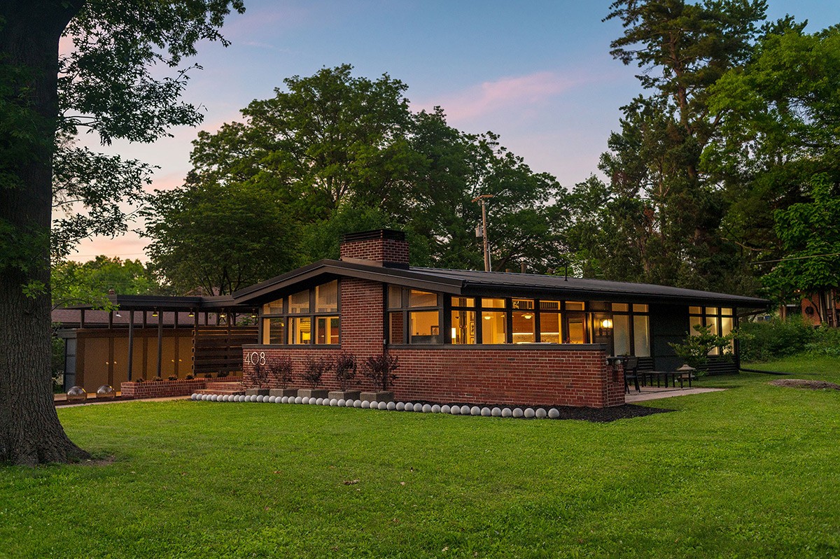 With its red brick exterior and striking black window frames, this mid-century modern house boasts a distinct charm. A low-pitched roof crowns the design, while a continuous line of windows threads the perimeter, flooding the interior with natural light.