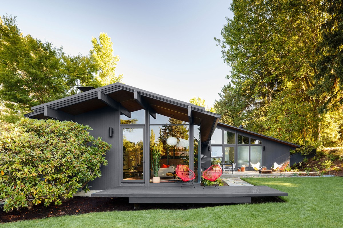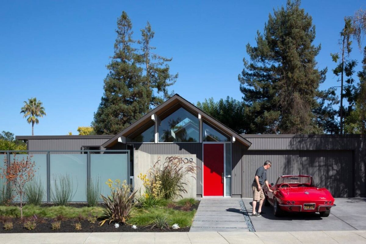 Located in San Francisco, this mid-century modern home exterior is finished in a modern gray colorway and a front door that melds contemporary and mid-century aesthetics. A glazed gable end fills the main living room with natural light.