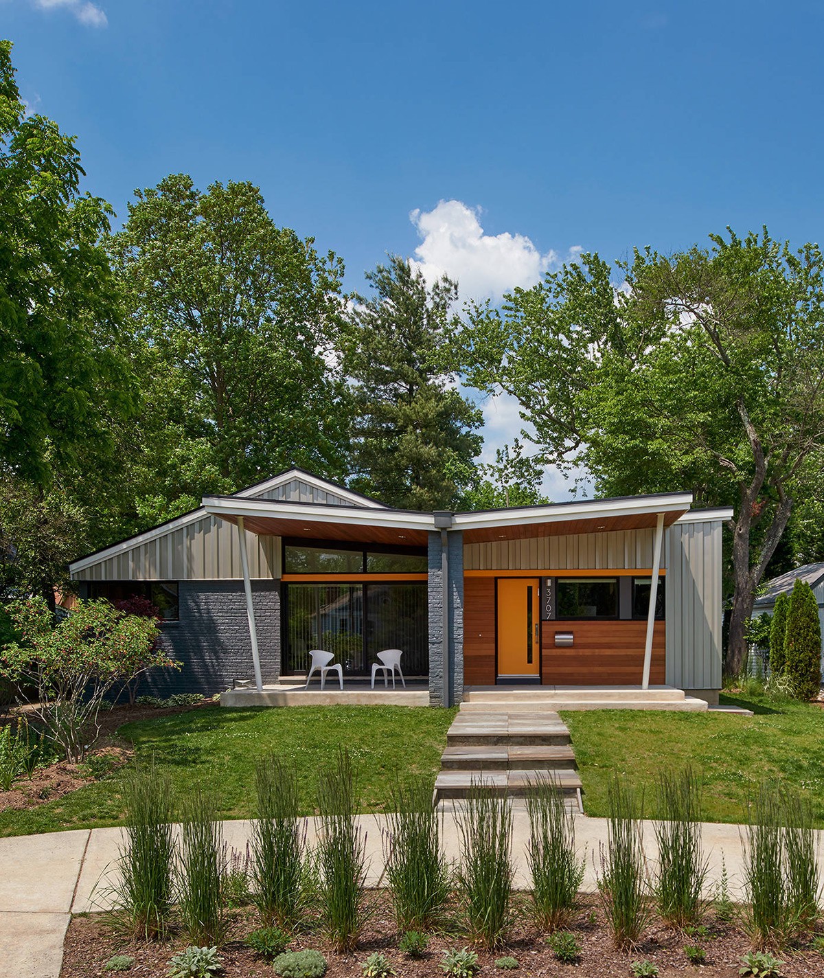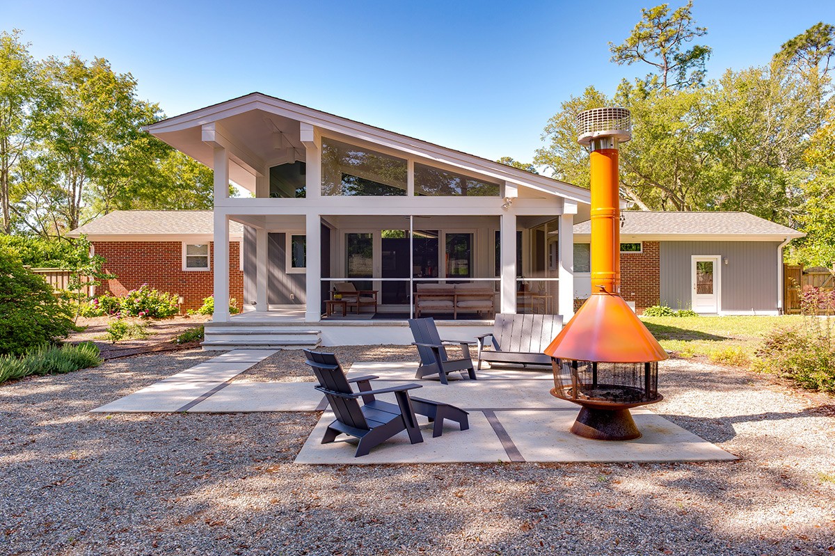 Characterized by a pitched roof extending over a terrace, this mid-century modern home smoothly combines indoor and outdoor living, providing a covered alfresco dining area.
