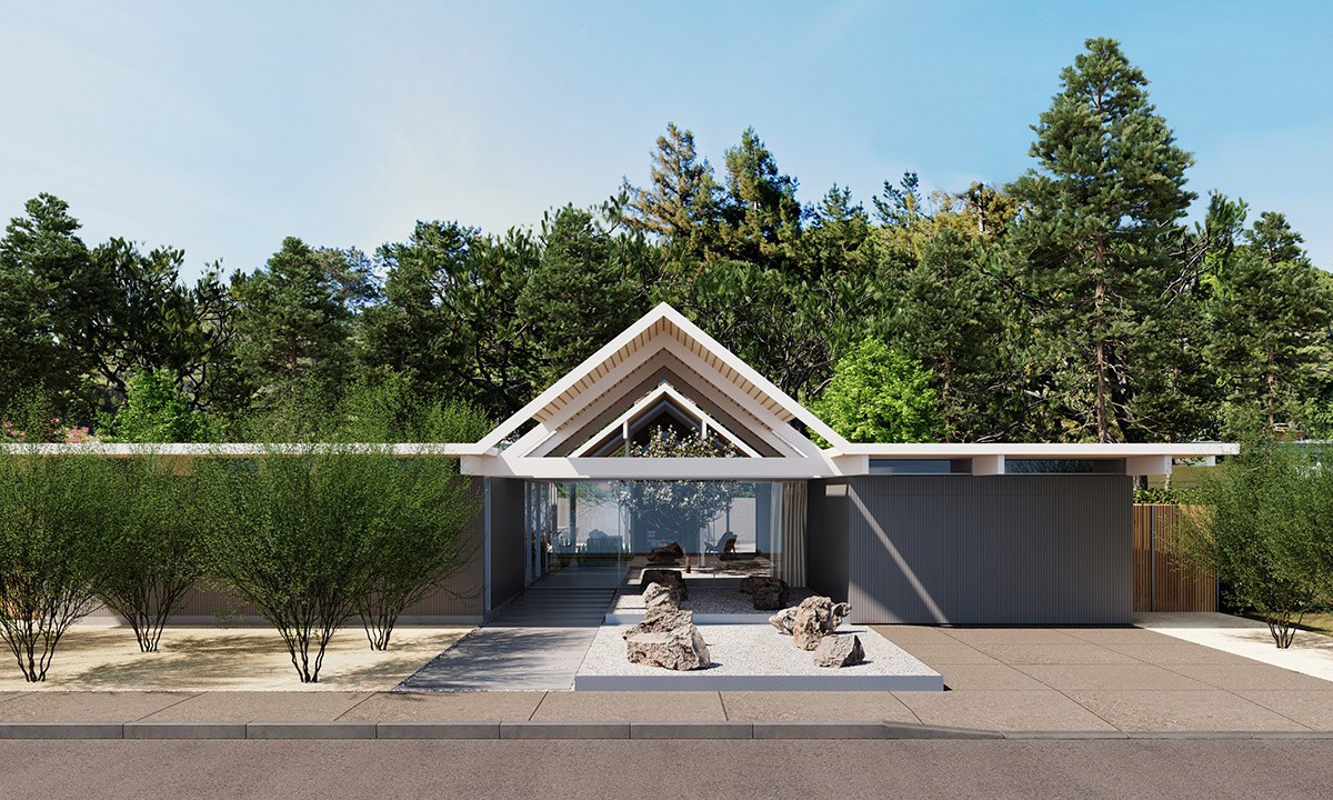 Modest in size, this mid-century modern house showcases a pitched roof and a calming gray exterior. It creates an illusion of floating above the uneven ground, embodying a serene and lightweight aesthetic.