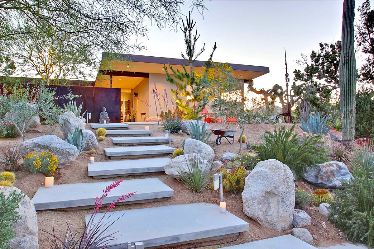 Hop on up a stepping-stone-laden incline to this mid-century home. Desert landscaping fills the slope with color and texture.