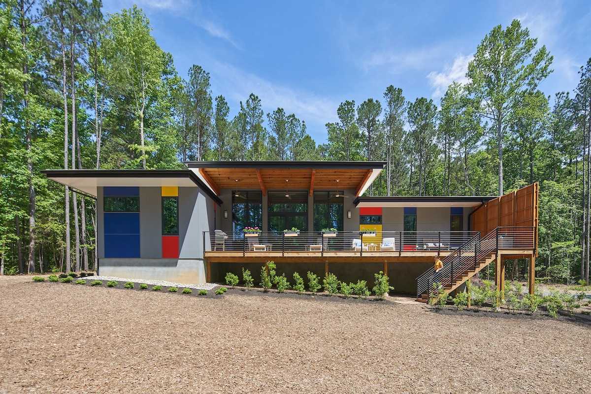 Drawing inspiration from Mondrian's iconic style, this mid-century modern house features a vibrant exterior adorned with artistic accents of red, yellow, and blue.