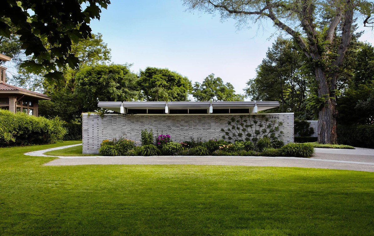 A curved driveway offsets the linearity of flat-roofed mid-century modern architecture.