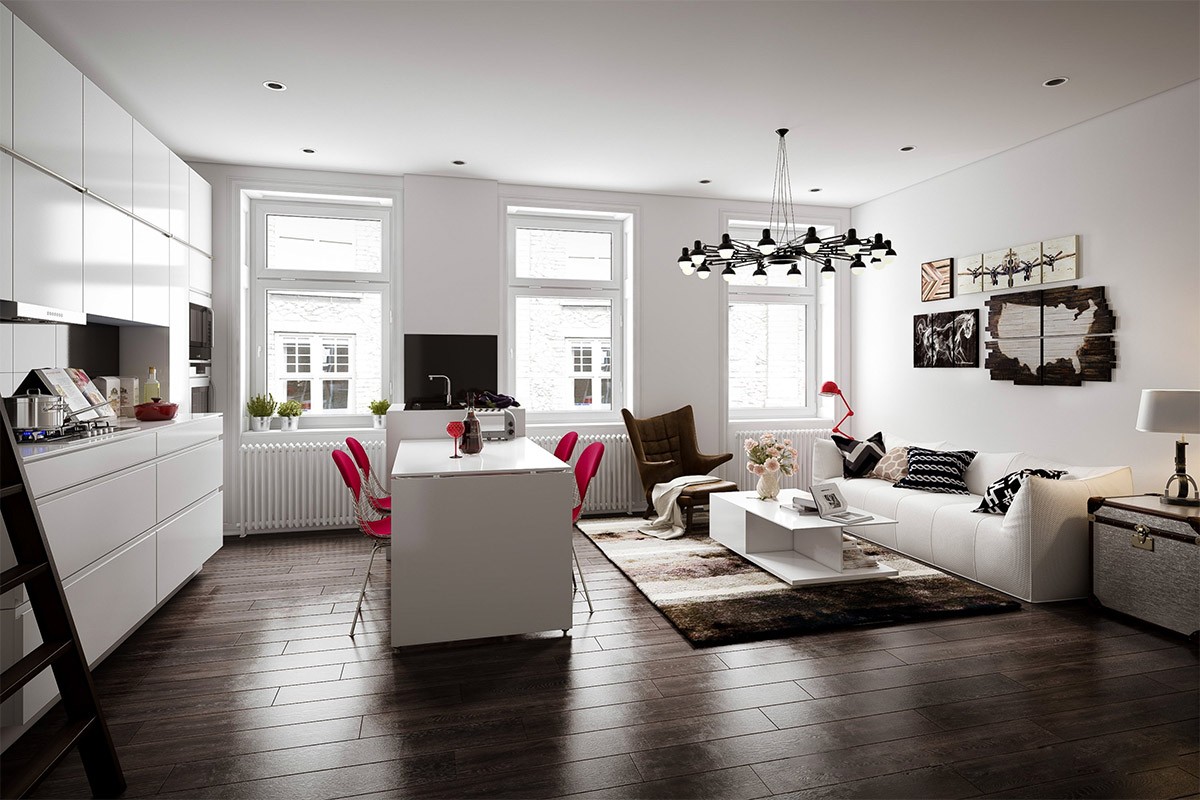 Scandinavian styling works particularly well with gorgeous wood flooring, whether new or vintage. The unique, circle living room chandelier adds a great touch.