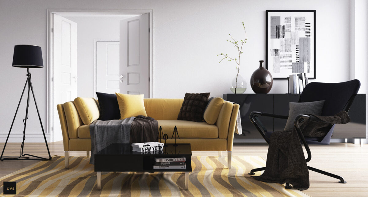 And a final entry into the black, white and yellow category is this dreamy mustard colored sofa.