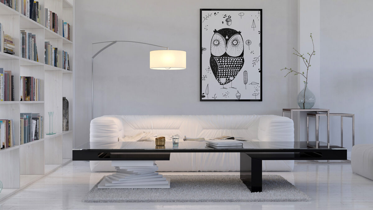 The minimalism of this style is offset by the whimsy of the oversized owl drawing. The large unique floor lamp adds a special touch.