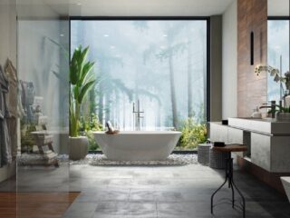 Make it his and hers. We’ve all seen twin vanity units but how about twin bathtubs? Patricia Urquiola created this for the Hangrohe Axor brand as a departure from traditional norms. Her charming collection is characterized by flowing transitions and curves. An abundance of indoor plants add in natural pattern and texture. Altogether, a superbly planned large bathroom.