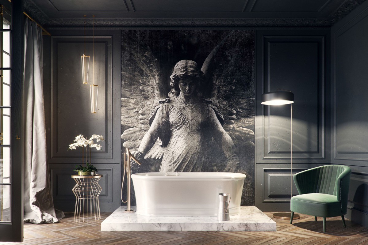 The hero of this room is most certainly the imposing garden statue art mural, softly lit by small bathroom pendant lights at one side and a floor lamp at the other.