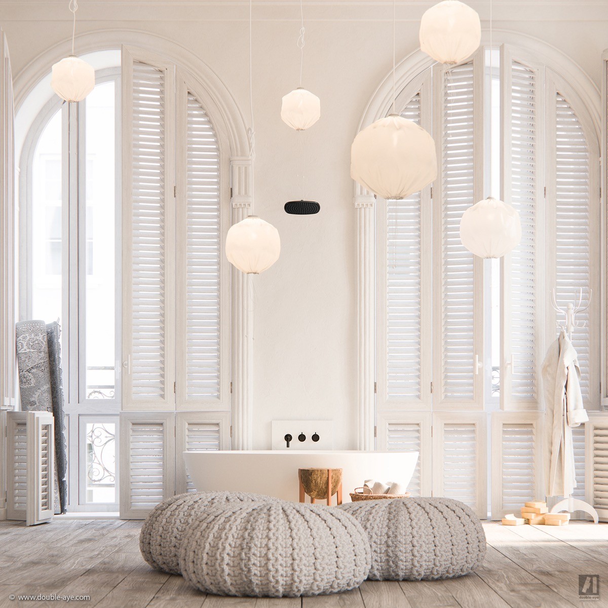 Bathroom window shutters suit traditional and modern decor alike. This eclectic minimalist bathroom, influenced by Wabi-Sabi, uses shutters to add a spike of classic French-Italian flavour.