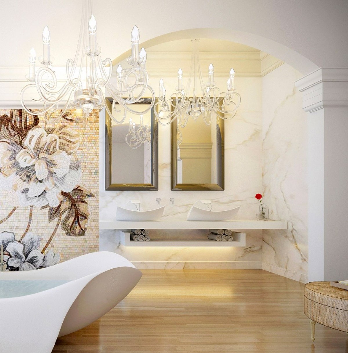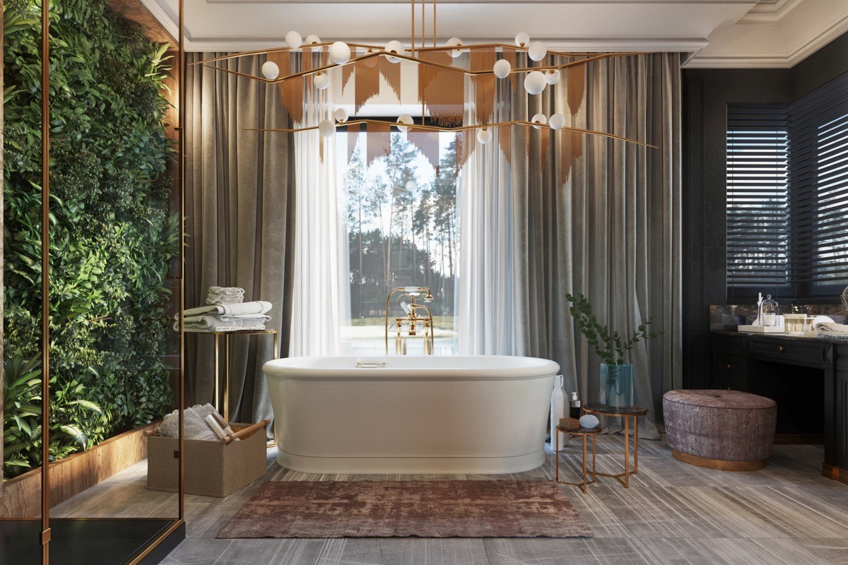 Suspend lighting over the tub. Nothing else has quite the same decadence in a bathroom like a piece of statement lighting suspended over a freestanding bathtub; be it a sparkling chandelier or shining globe pendant lights.