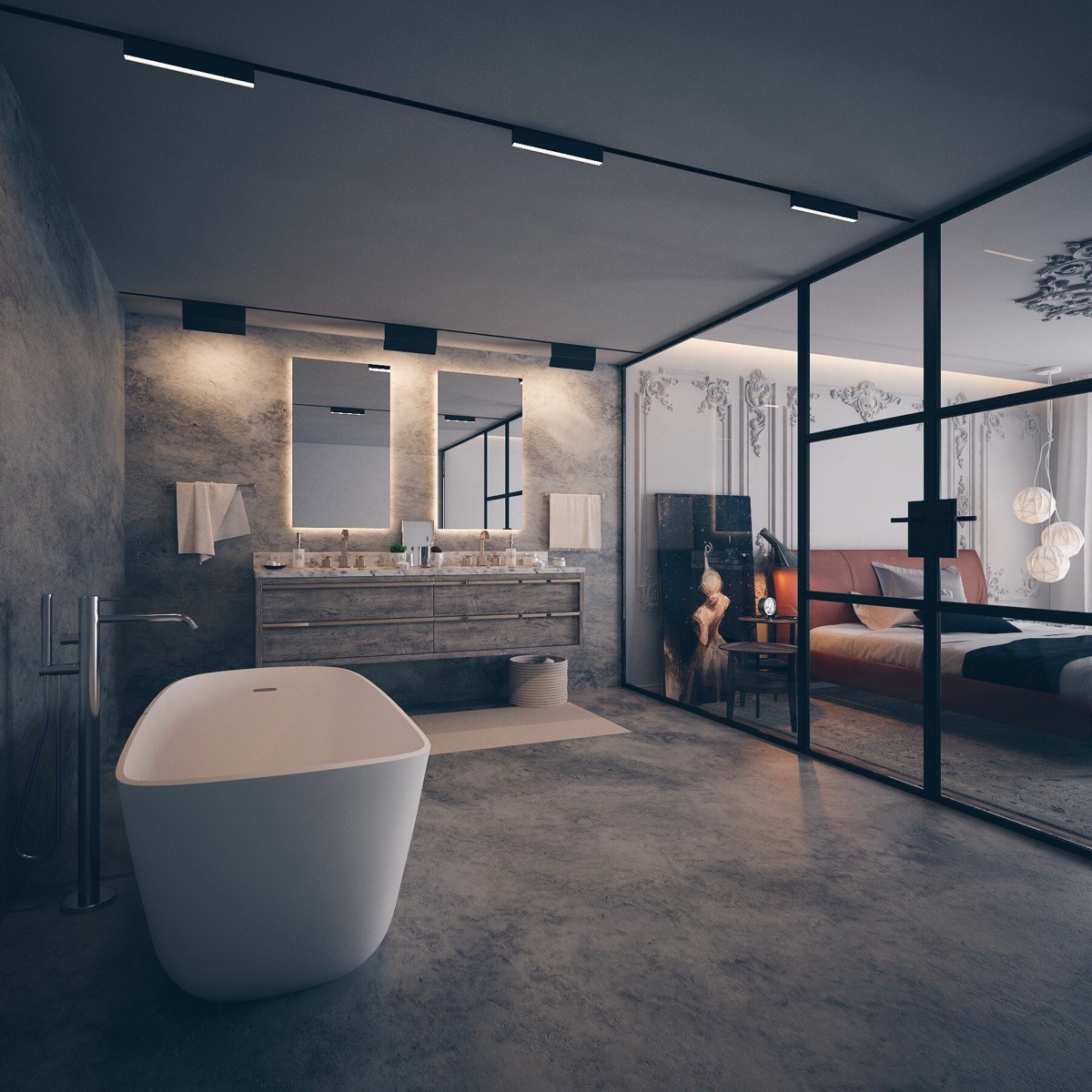 Forget walls and doors, have a floating bathroom. A sprawling master suite doesn’t have to be divided into a bedroom, a dressing room and a bathroom. This design implements only partially dividing walls to house essential plumbing. The shower surround is almost completely invisible.