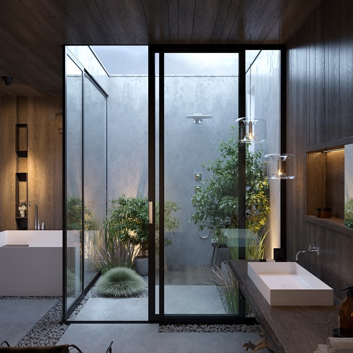 Blur the border between a garden and a bathroom. Standing a bathtub on a floor of pebbles creates a natural flow between inside and outside spaces. Grow an indoor garden of potted plants with long fronds to keep the theme going.