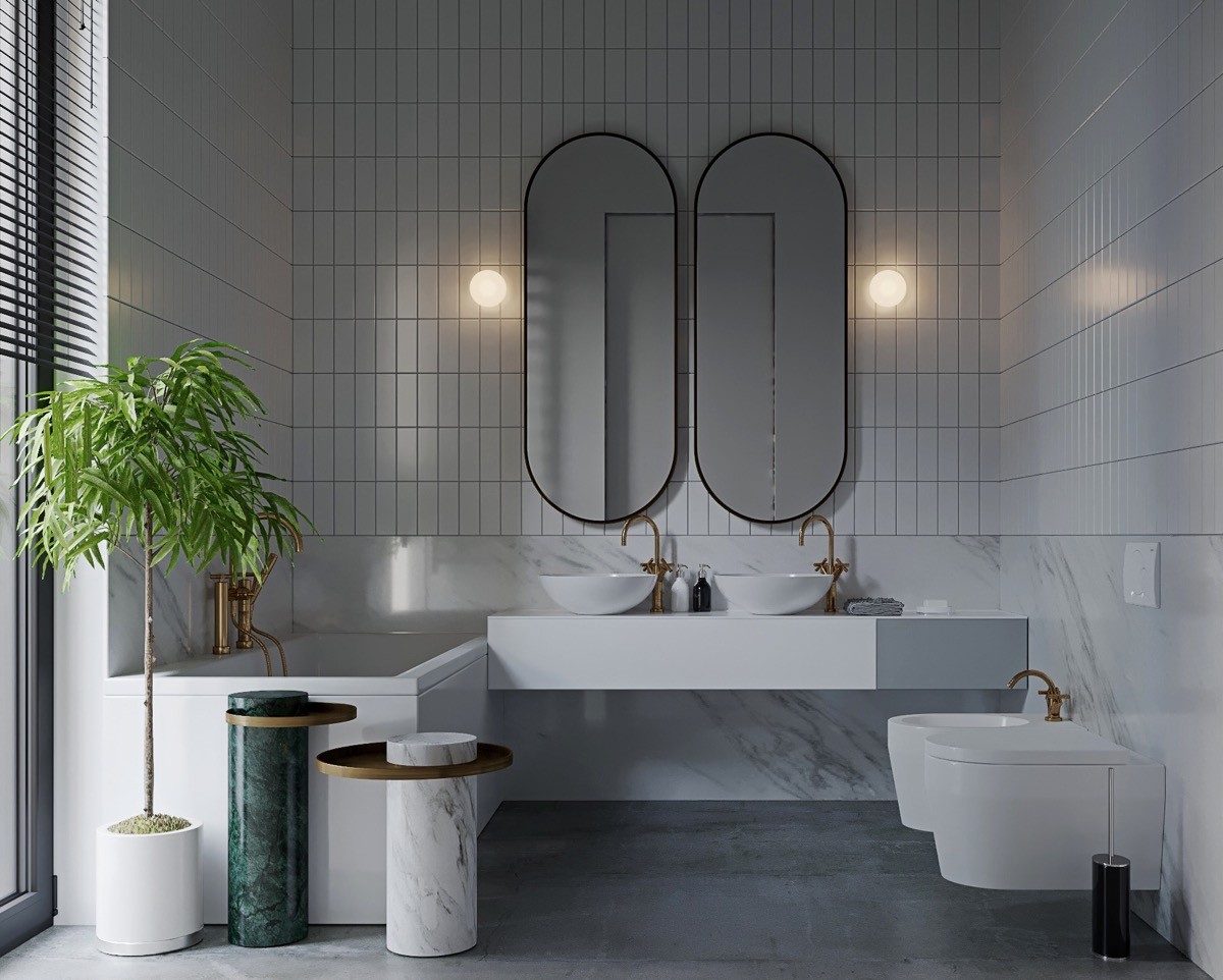 Make it a double. A twin vanity unit can be accessorised with a single large mirror, though doubling up mirrors and modern wall sconces certainly draws more attention to the luxury of having two individual wash zones.