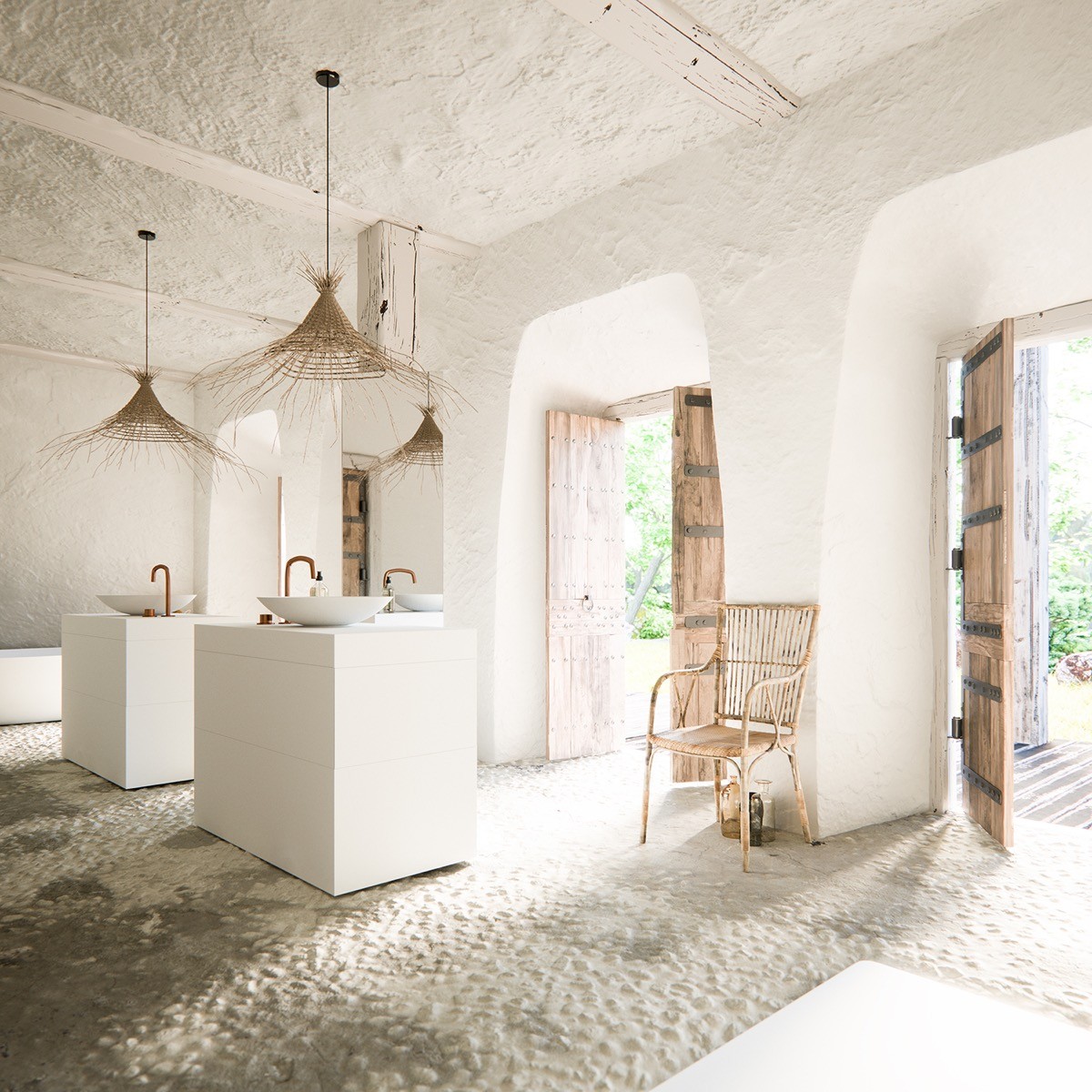 Curate a rustic bathroom scheme by selecting highly textured, natural elements. Team the rustic pieces with some modern furniture to keep the look current, like these sleek sinks from By Coccoon.