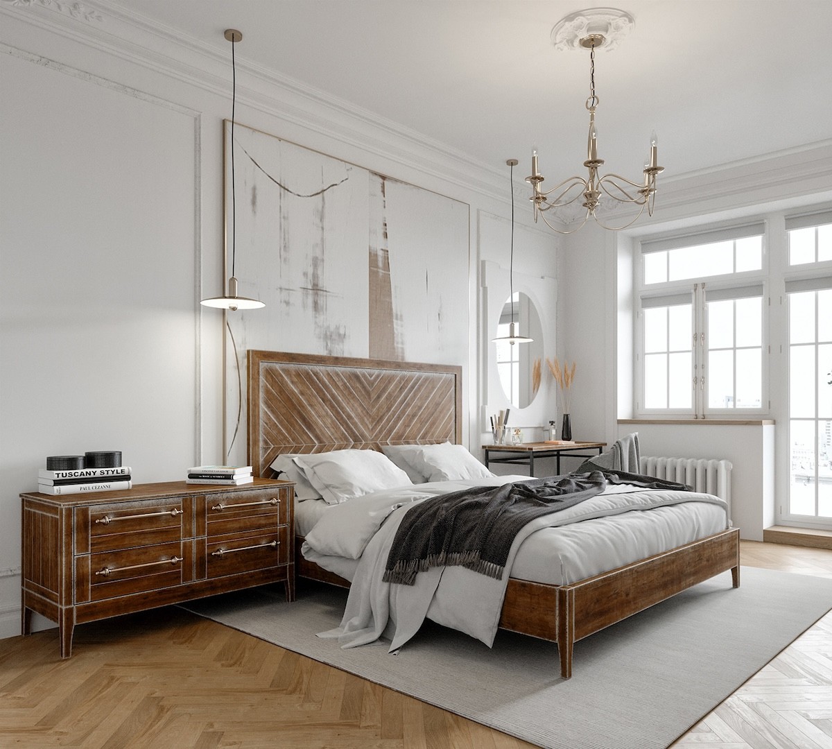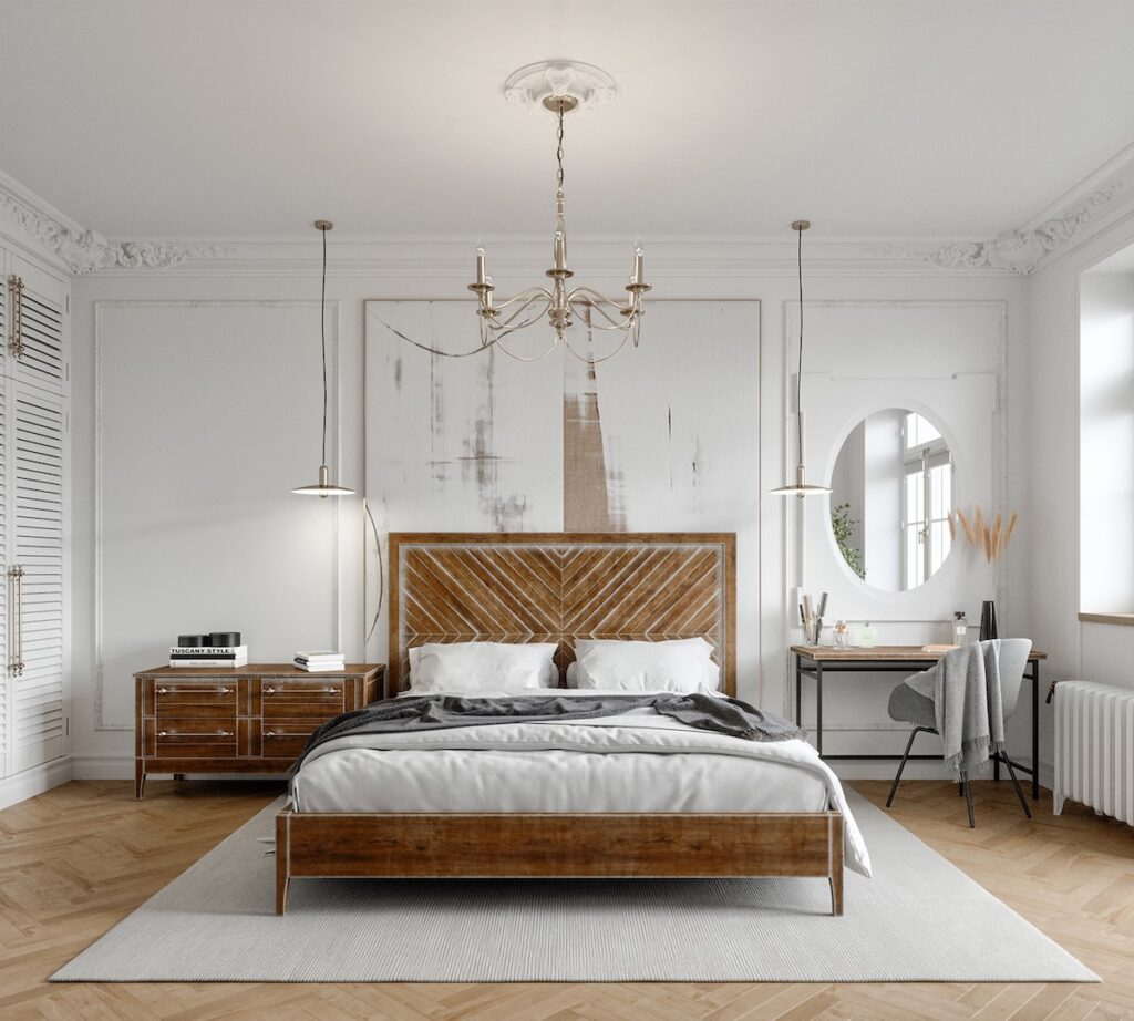 The loft apartment may feature one bedroom—but it sure makes a statement with its modern-traditional style! The crisp white walls and understated artwork account for a contemporary aesthetic, while the mid-century chandelier and rustic furniture (with a weathered charm) bring in a traditional vibe.