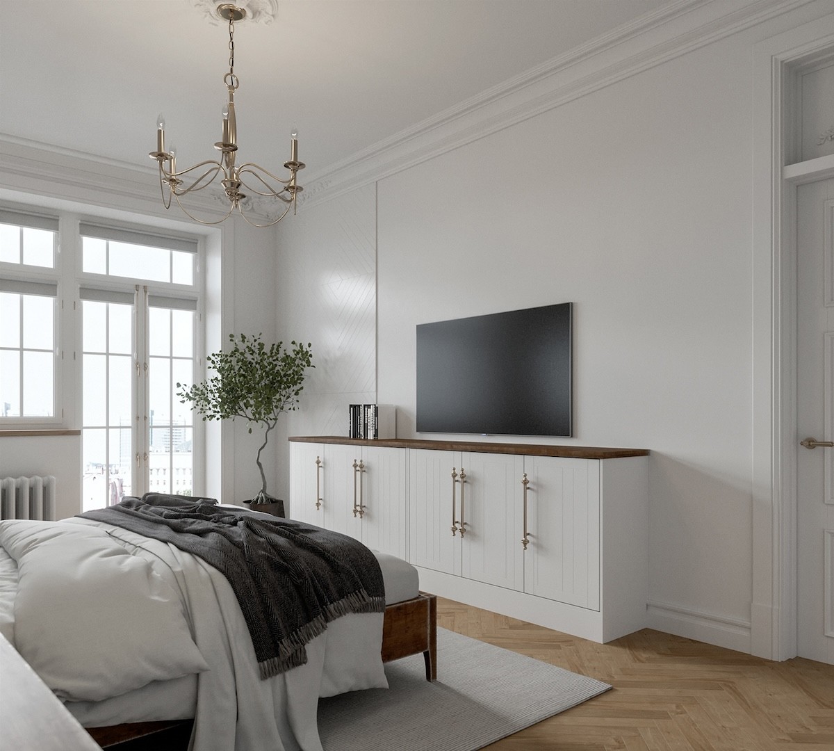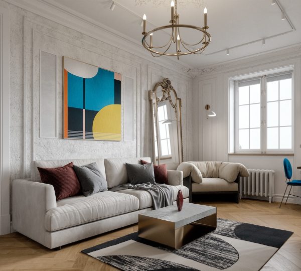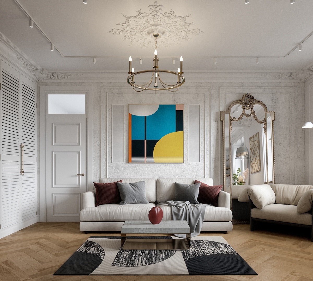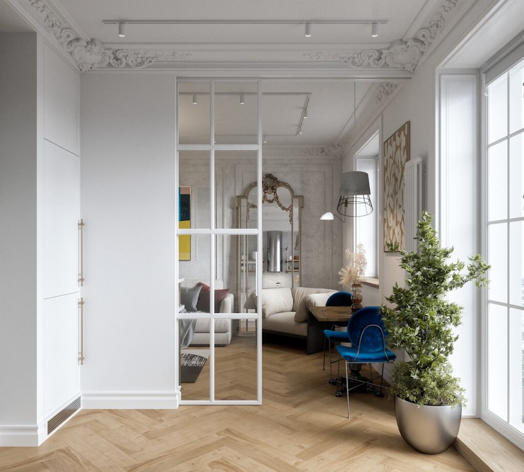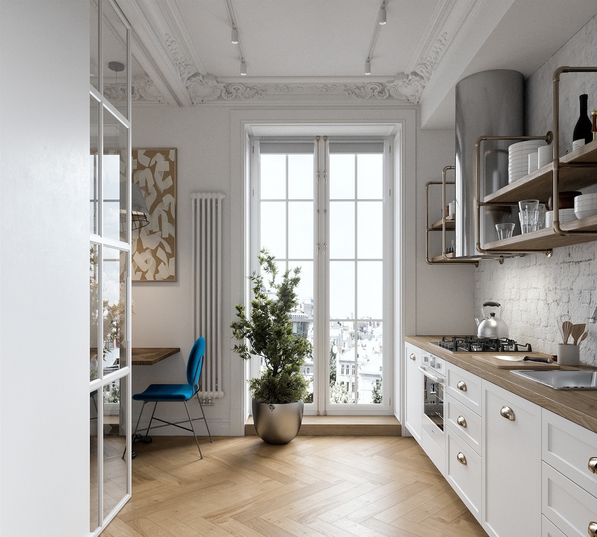 This loft apartment, a project by Maxim Shpinkov, captures the modern classic design in a small loft apartment. The project shows us how space may be a constraint in interior design—but it can be easily overcome with the proper design techniques! From wooden flooring to classic white walls, we see plenty of design secrets coming together to bring this space to life.