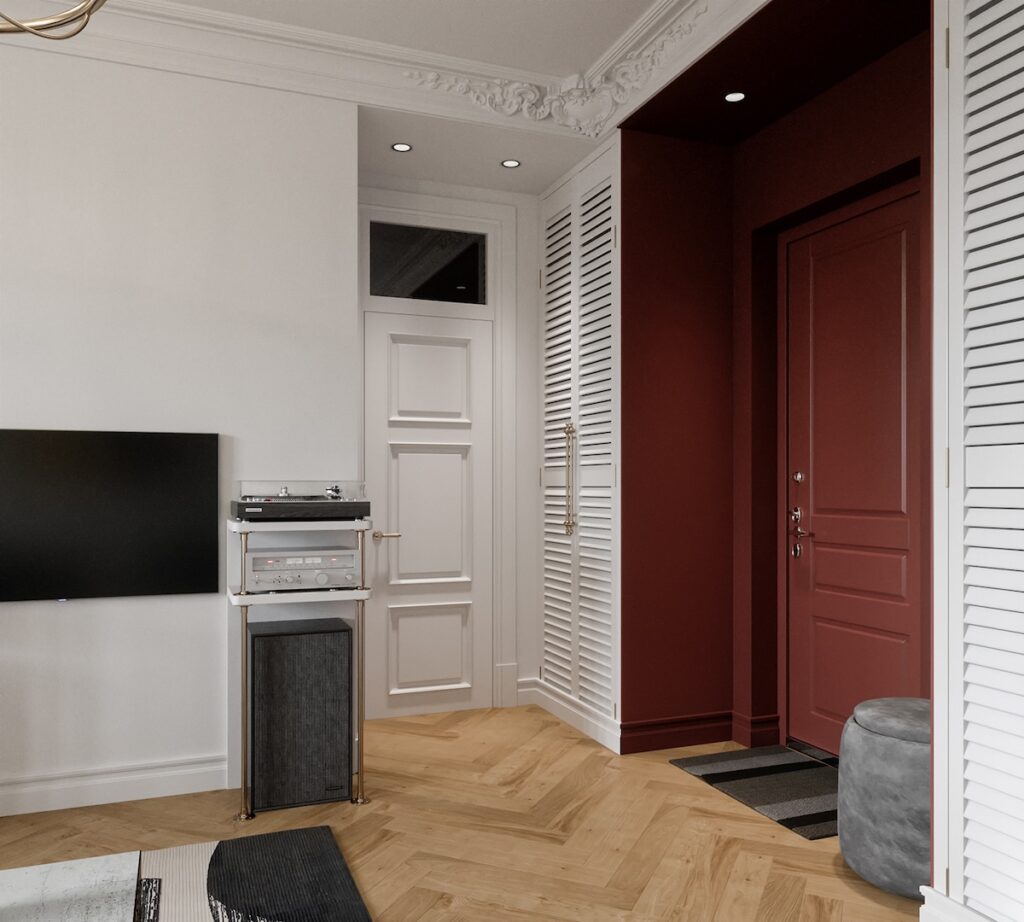 The foyer. A solid maroon section flanked by textured white cabinetry. This space creates an intriguing first impression, sure to captivate anyone walking in. The rug here makes the ambiance inviting, while the ottoman provides a quick seat for residents putting on shoes as they walk out of the house.