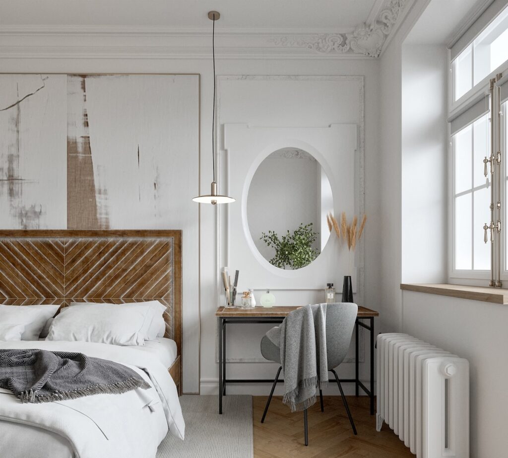 The stark white walls are a design secret to opening up a compact space (bonus points for the mid-century mirror, reflecting natural light as it enters from the window). But, simultaneously, we see the wooden flooring and soft furnishings factoring in warmth. This is complemented by bold punches of color introduced with artwork. A beautiful balance between contemporary and cozy is the final result.