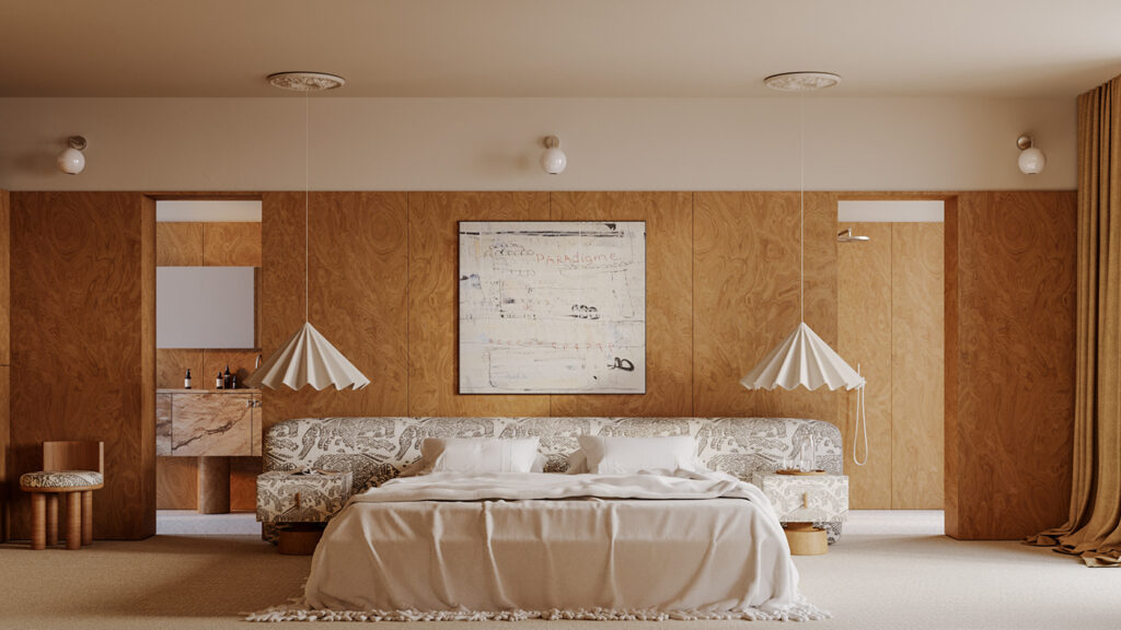 This bedroom is designed to feel quietly luxurious. The layout is symmetrical, which brings a sense of order. Wood-paneled walls wrap the space in warmth, creating a cocoon-like atmosphere.