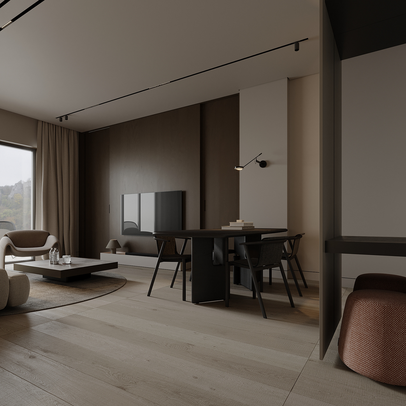 The open-plan living space feels spacious yet intimate. Its layout encourages relaxation and allows residents to effortlessly move around—despite the compact space. The area for lounging is positioned right next to the dining and kitchen areas, which fosters an organic flow of conversation.