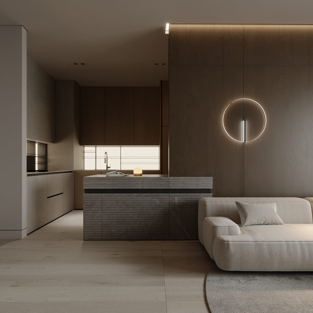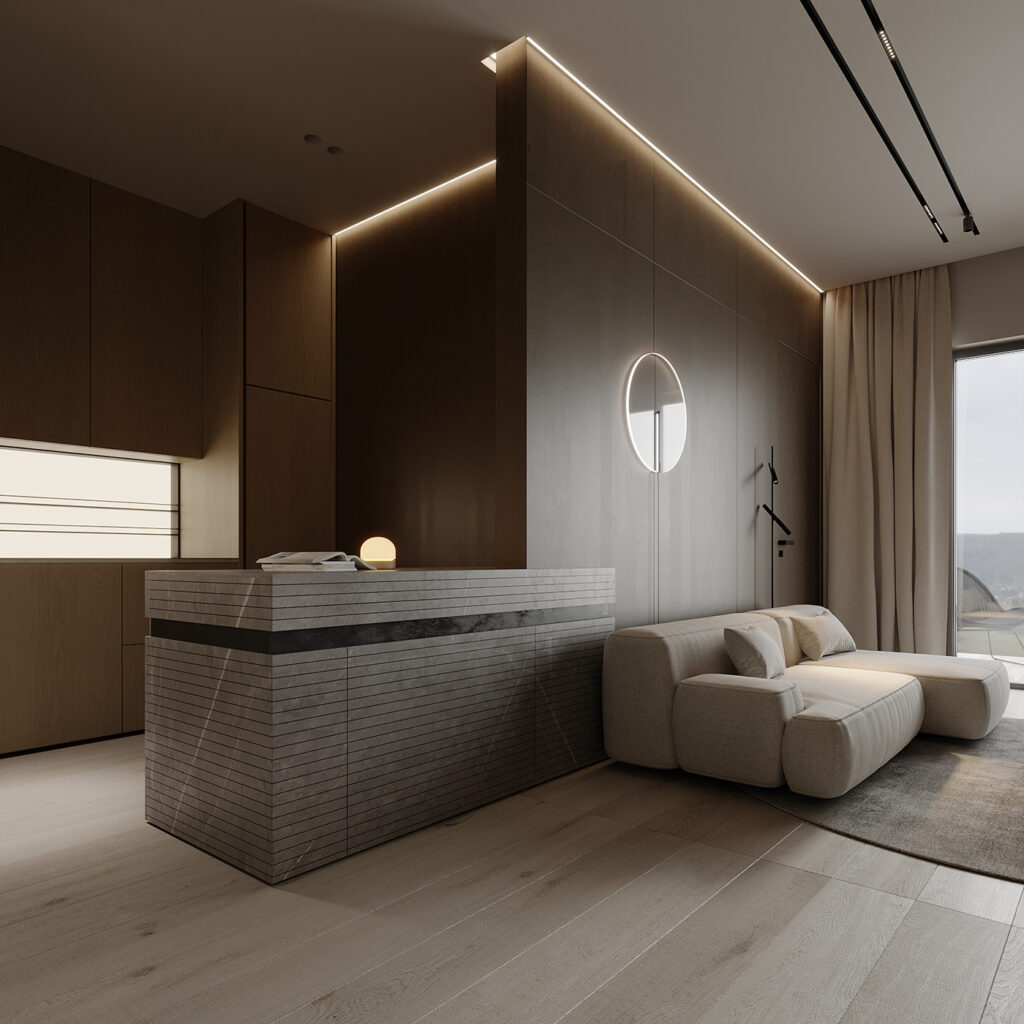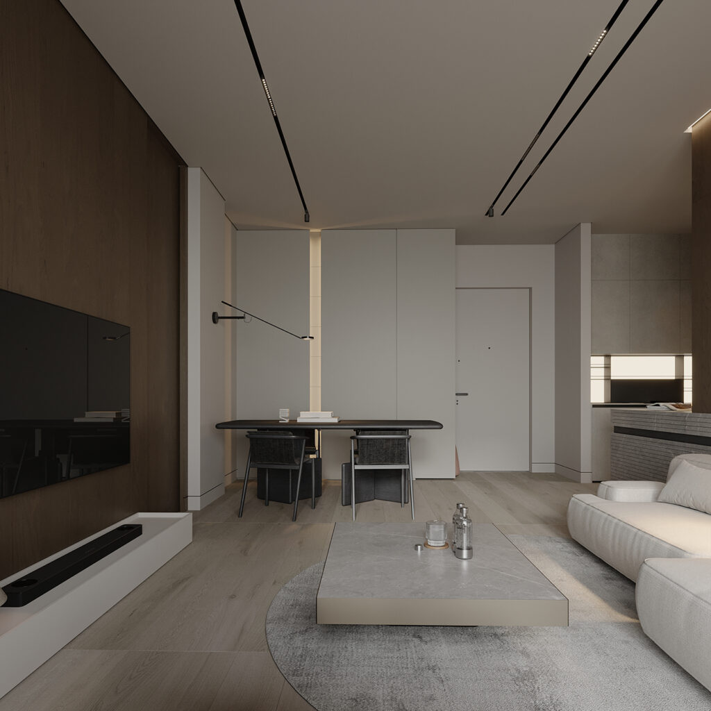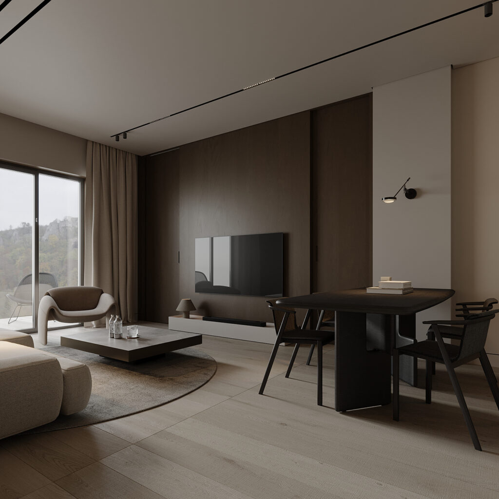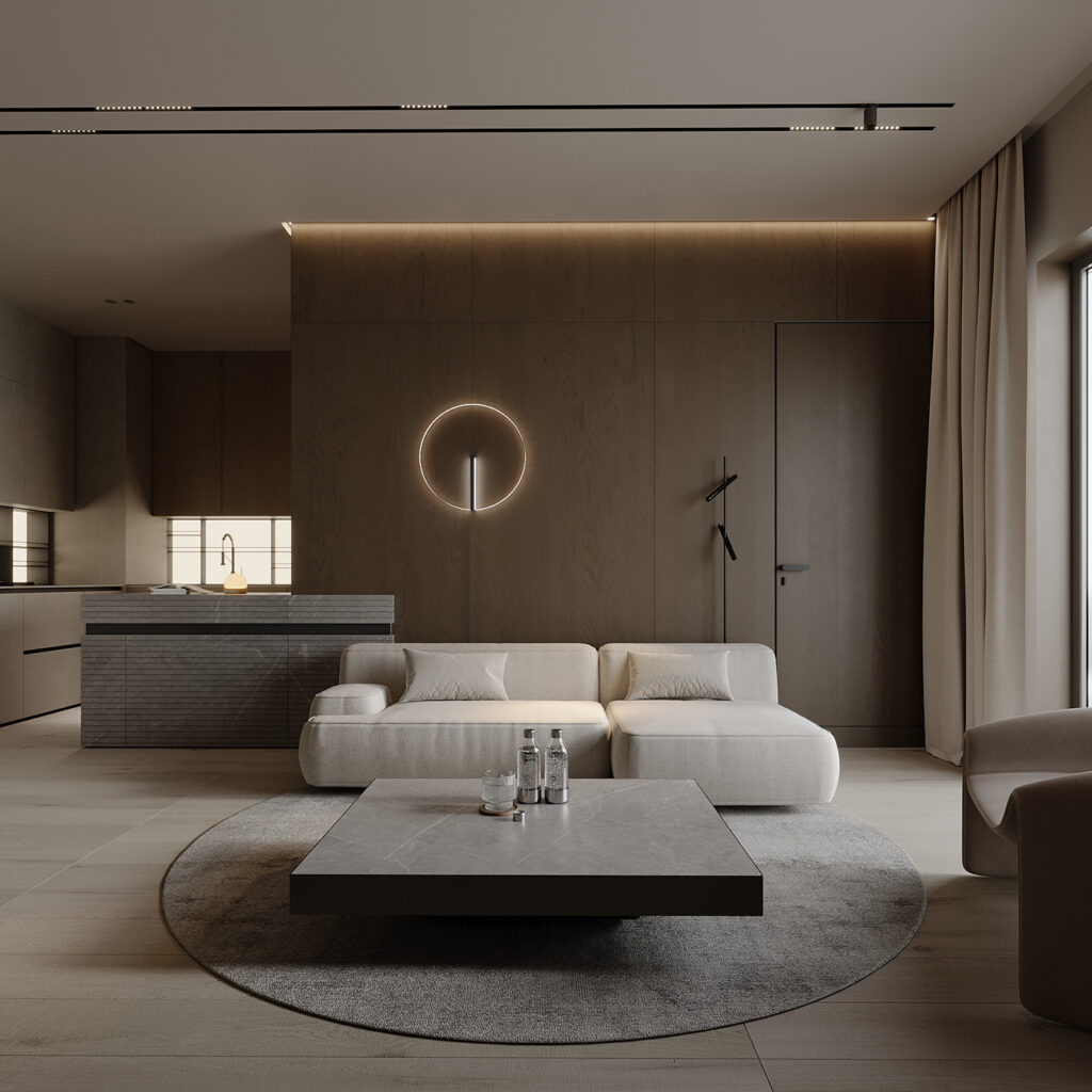 At the center of the living space is a low-profile modular sofa. Its rounded silhouette adds organic forms. The muted area rug softens the space underfoot. Opposite the sofa, a sculptural accent chair with fluid curves adds an artistic touch.