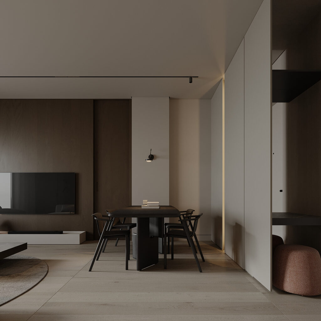 Finally, the dining area in the Ember Apartment is a matte black, organically shaped dining table. It is sleek in build, so it occupies less visual estate, while still providing ample room for residents to enjoy meals and create memories. A swing arm wall lamp makes sure they can get targeted lighting as and when needed.