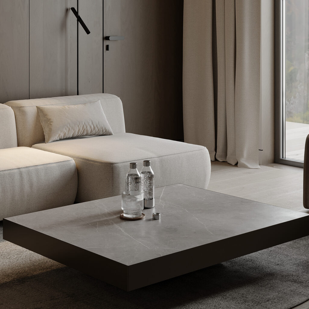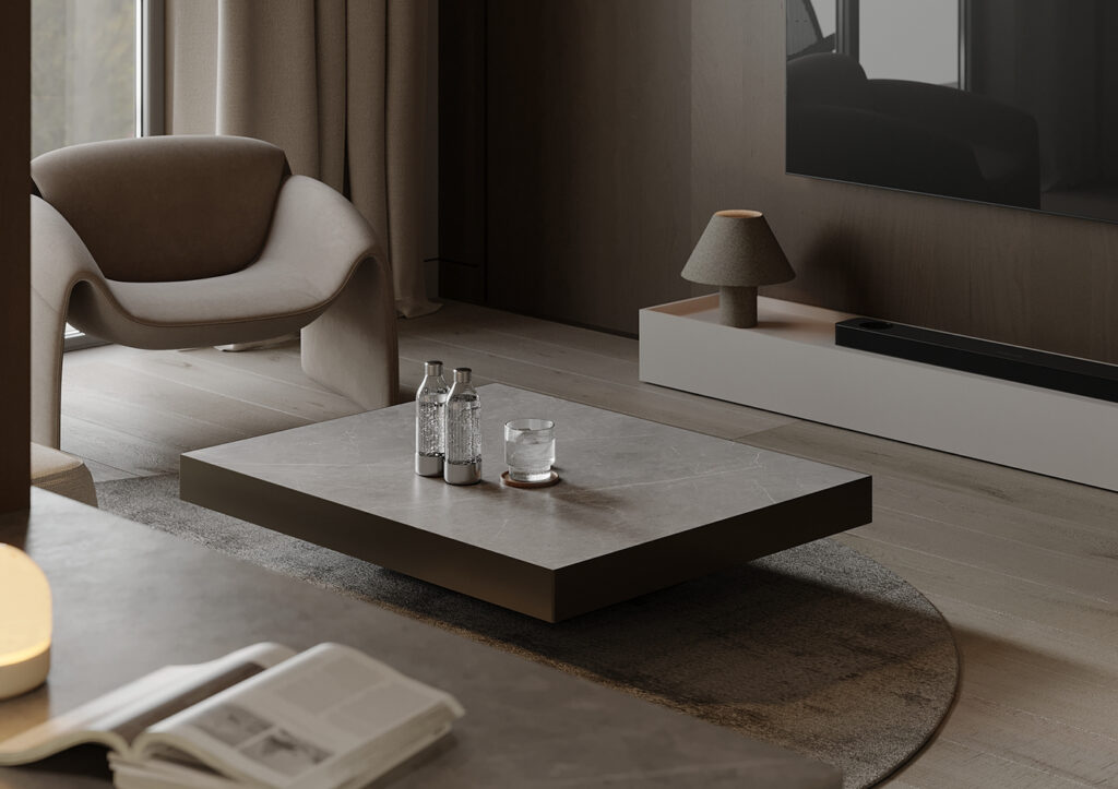 A monolithic coffee table in dark-toned marble serves as a focal point in the living area. It has a sleek and rectangular finish a sleek stone finish.