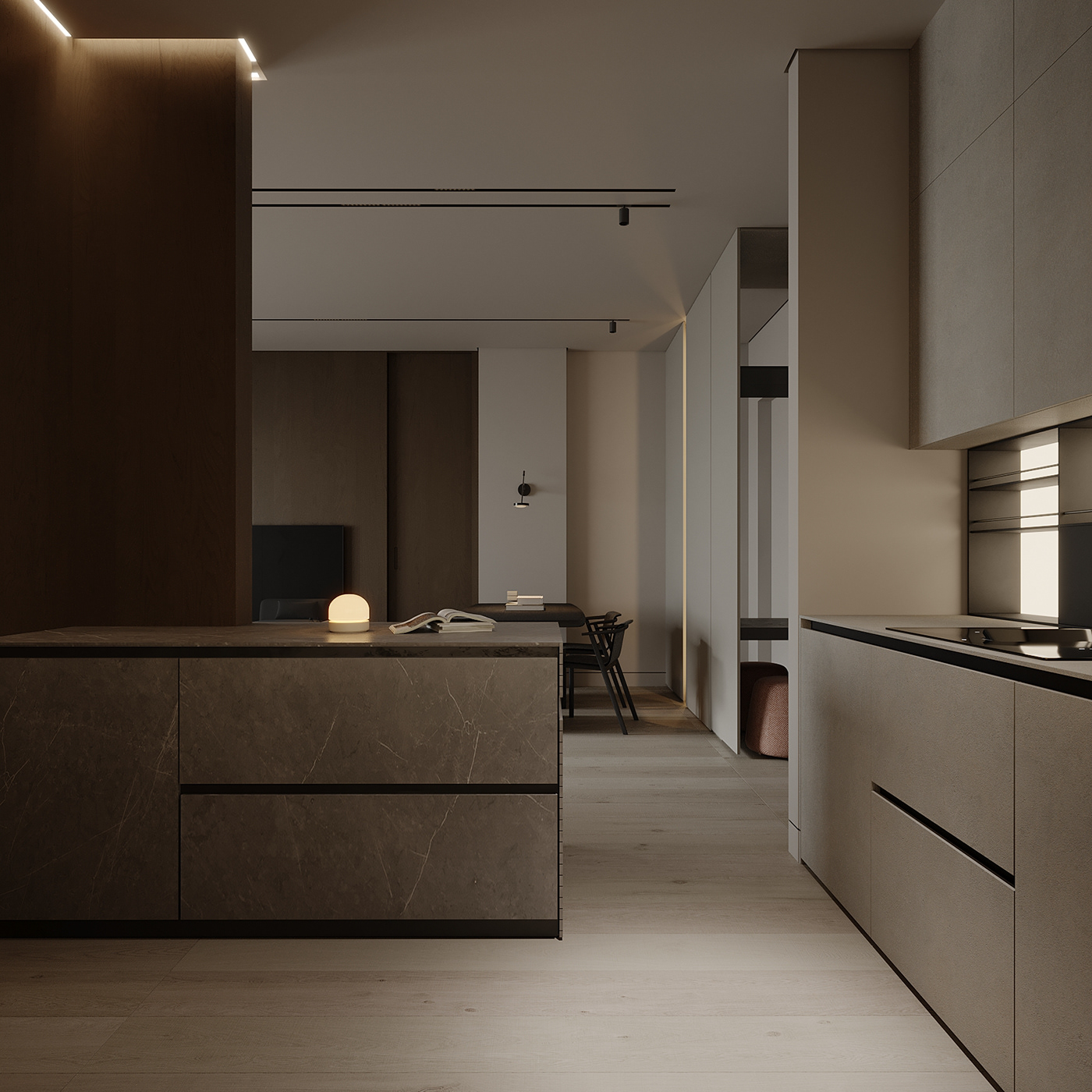 The kitchen in the Ember Apartment features an island as the partition—a space-savvy design trick. It is striped on one end and features a marble pattern on the other. If residents want to enjoy dining here, the island has potential to add on a few bar stools, too. The cabinetry is matte and hardware-less, adding to the modern vibe of the space.