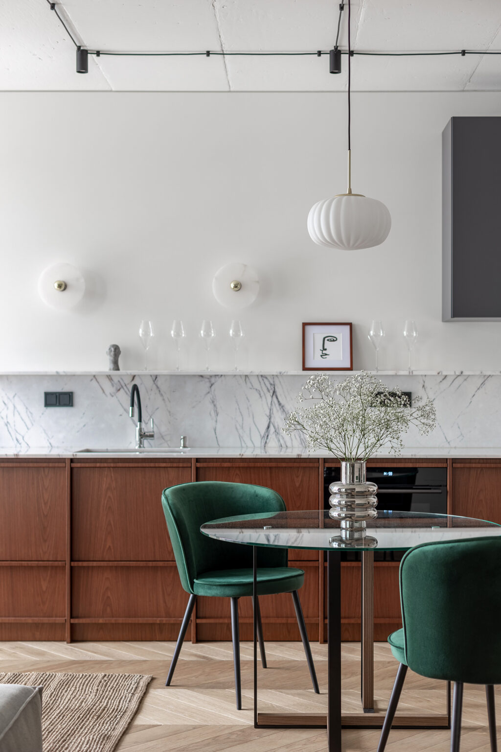 And let’s talk about those emerald green chairs. They anchor the space with a sense of richness, making the dining table feel like a design statement rather than an afterthought. The round glass table adds to the effect: it reflects light, keeps sightlines clear, and makes the room feel bigger than it is.